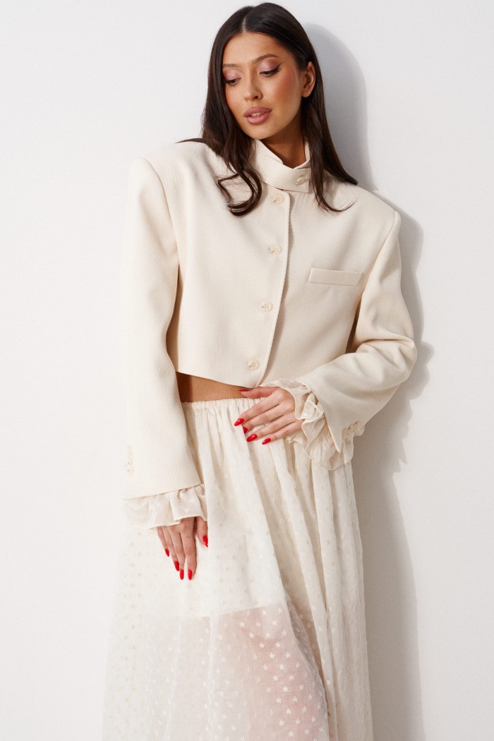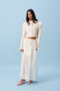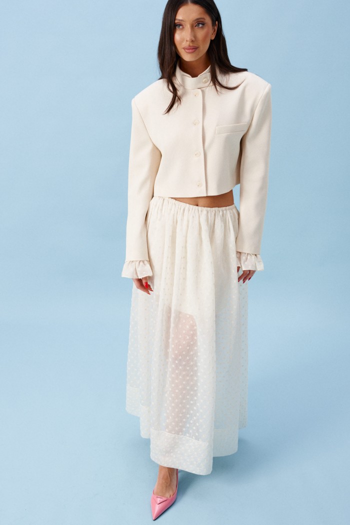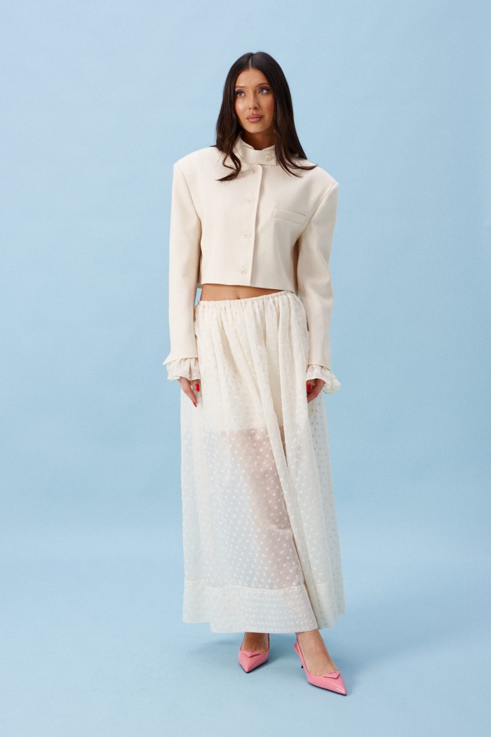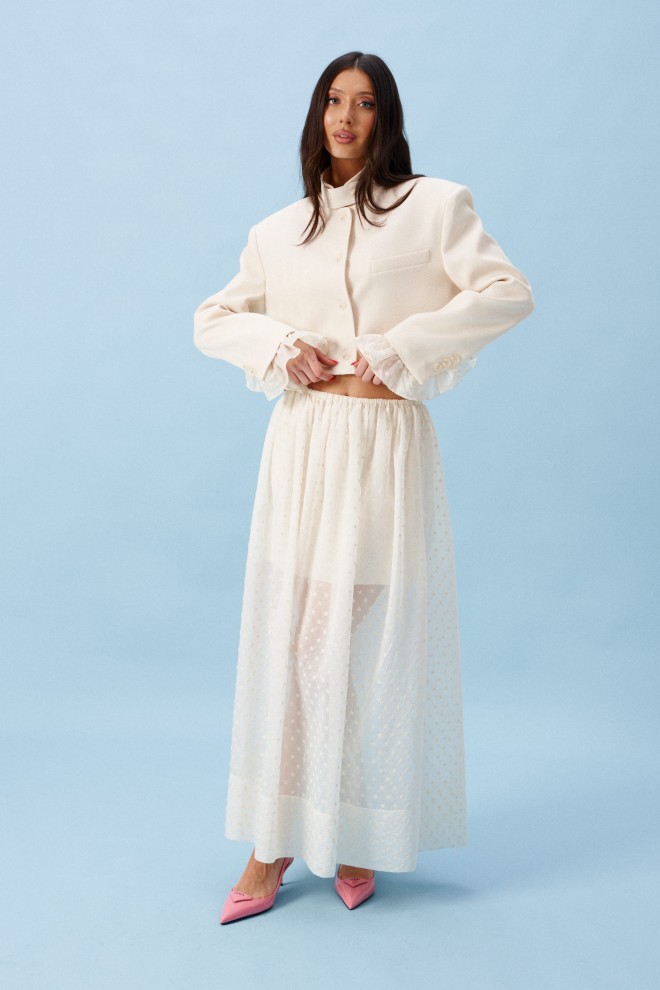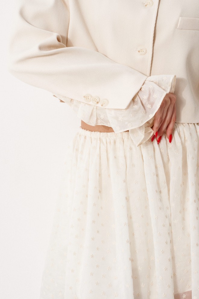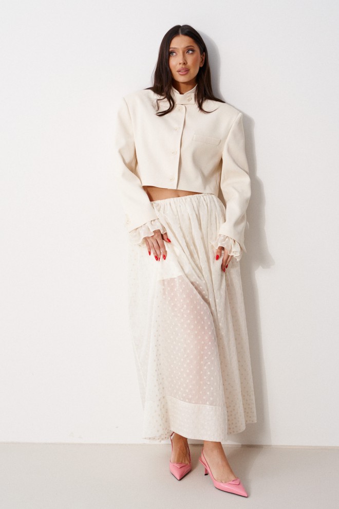 Юбка свободного кроя, выполнена из прозрачного полотна бежевого цвета с вышивкой. Характеристики: подкладка короткая, пояс на резинке. Длина юбки по боковому шву 94 см, длина нижней юбки 37 см