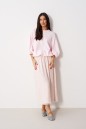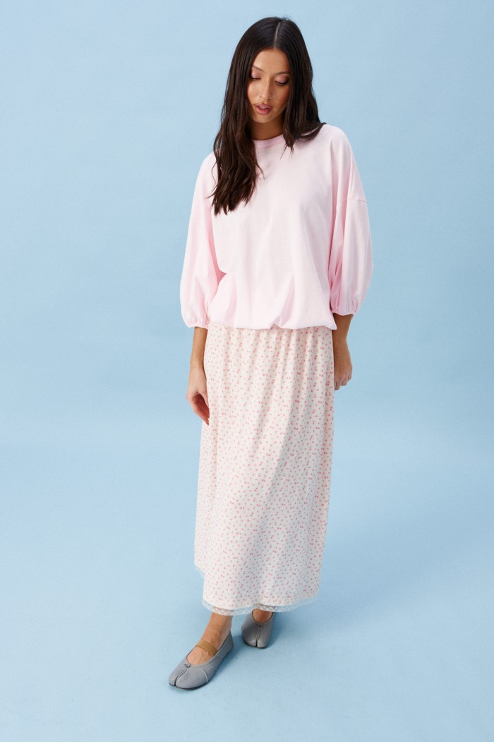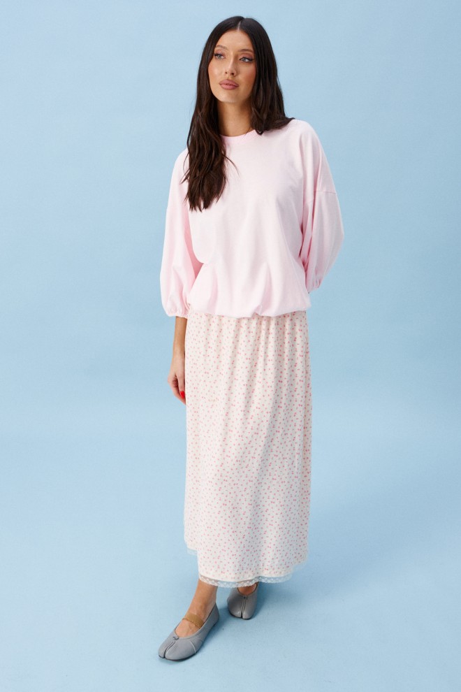 Юбка прямого кроя, выполнена ткани нежно персикового цвета в мелкий цветок. Характеристика: прямой крой, на подкладке, пояс на резинке, по низу изделия кружевная тесьма. Длина юбки по боковому шву 89 см.