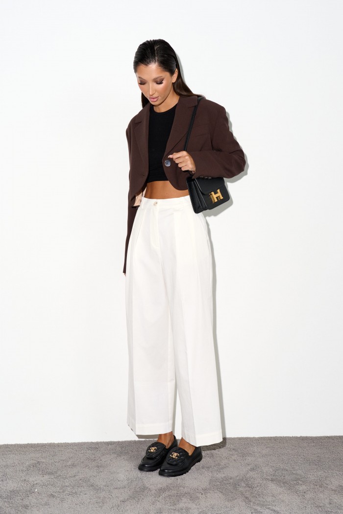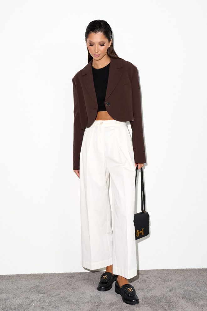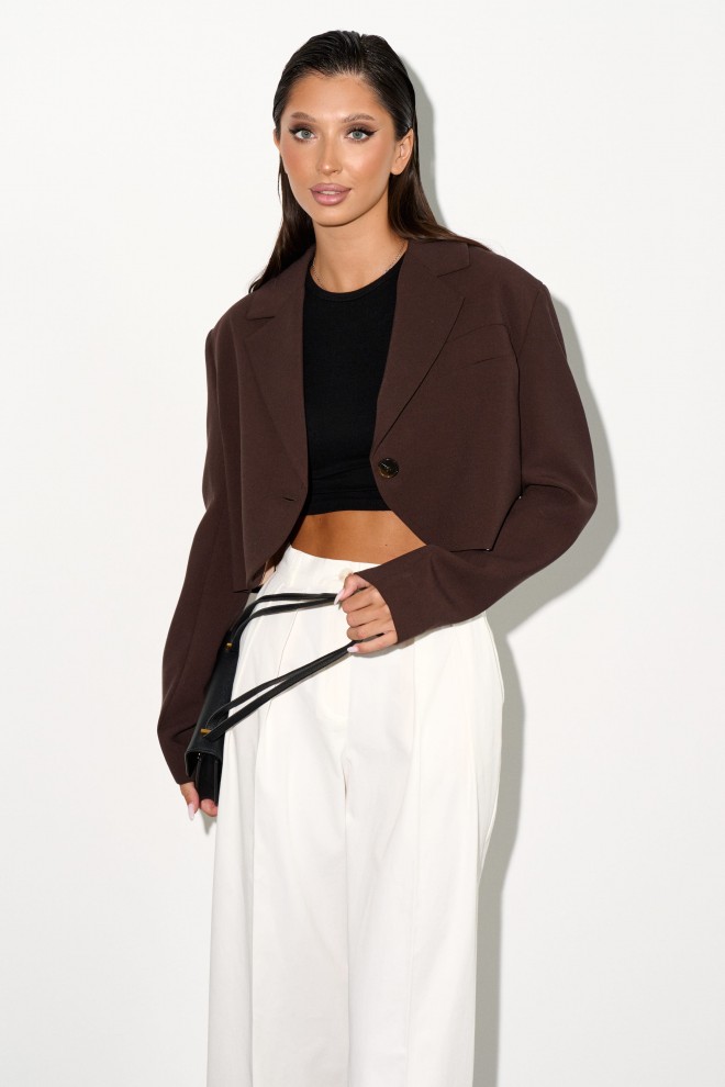 Стильный укороченный жакет выполнен из костюмной ткани цвета шоколад.