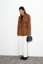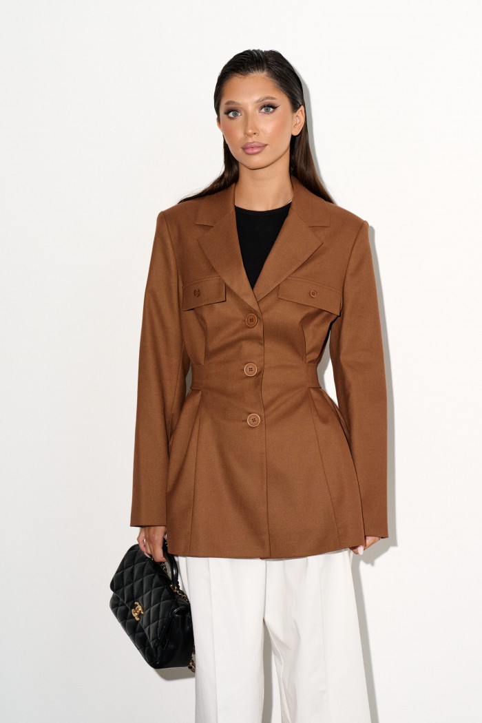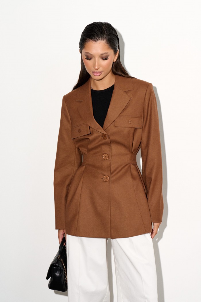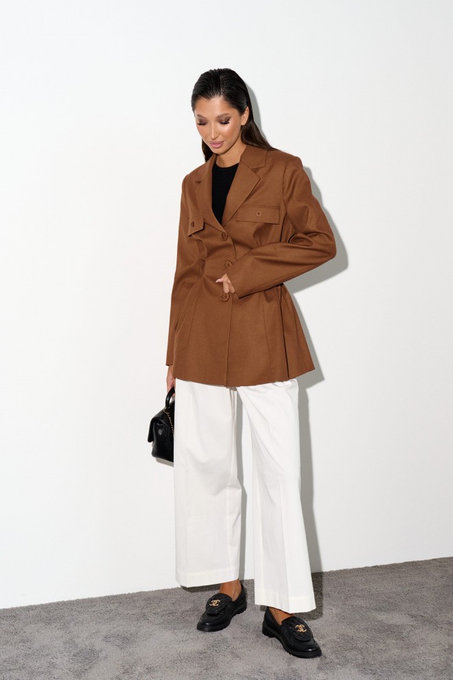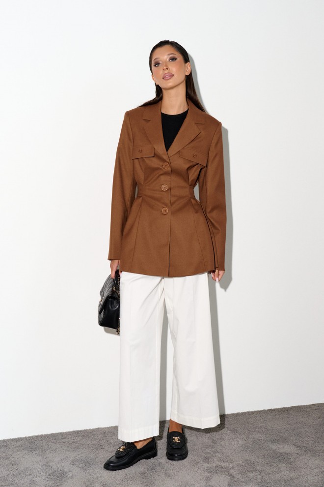Стильный жакет прямого кроя выполнен из костюмной ткани цвета шоколад.