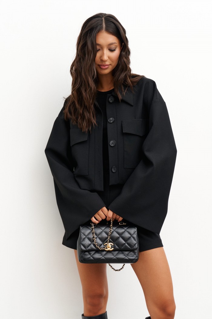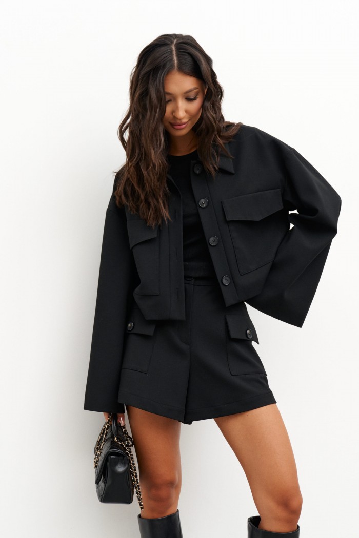 Жакет укороченный выполнен из плотной костюмной ткани. Характеристики: прямой свободный крой, подкладка бежевого цвета, воротник рубашечного типа, застежка центральная на петли пуговички, рукав втачной расклешеный слегка спущен, по низу рукава разрез,над которым размещена зололая пуговица. Длина жакета по спинке 45, длина рукава 54 см.