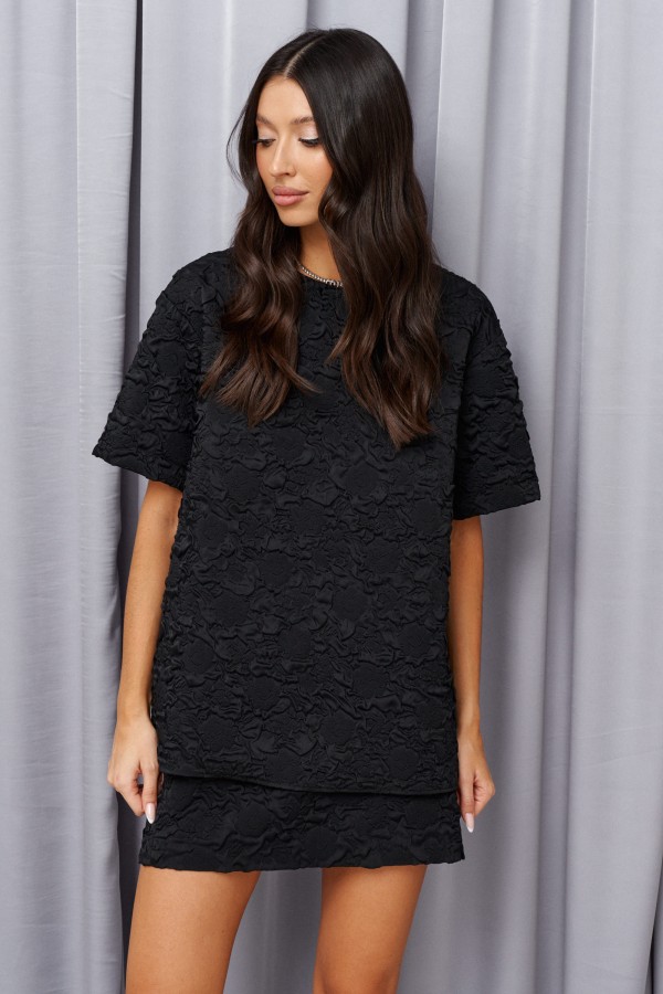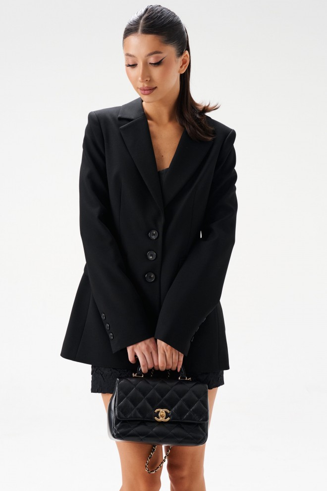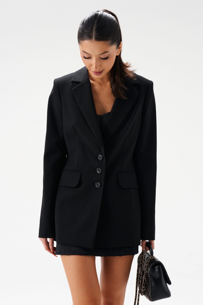 Жакет однобортный. Выполнен из костюмной ткани чёрного цвета. Прилегающий силуэт, подклад, подплечники, талиевые выточки по переду, отрезной бочок, в спинке изделия разреза нет. Вортоник отложной с лацканом. Застежка центральная на петли-пуговички. Карманы по переду внизу (с клапаном) функциональные. Рукав втачной, на рукаве петли-пуговицы (нефункциональнные), длина 66 см. Длина спинки жакета 72 см.