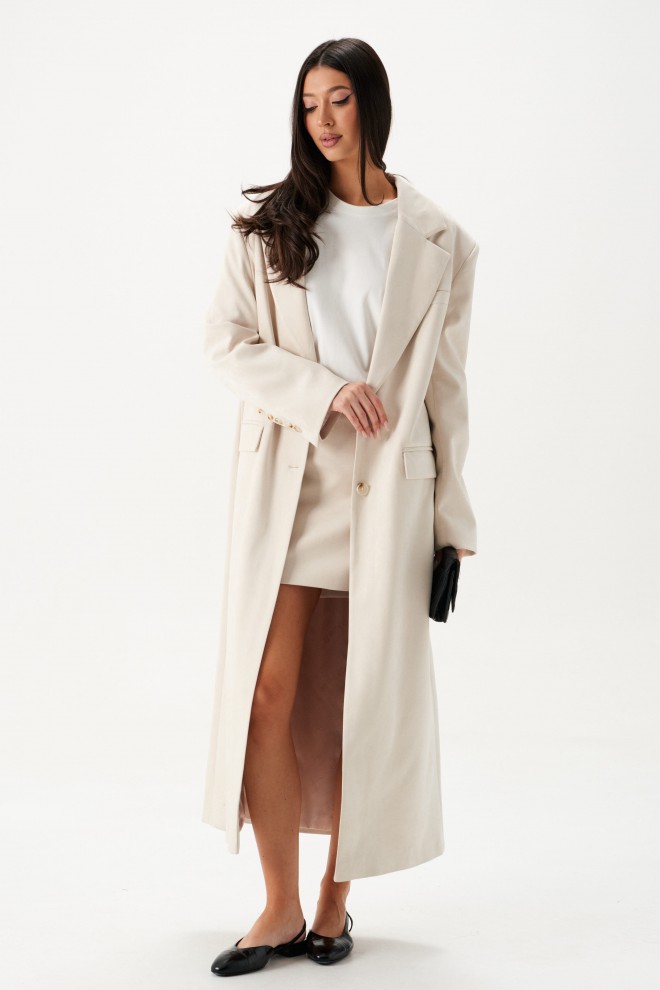 Жакет прямого свободного кроя, выполнен из имитации замши. Характеристики: прямой крой, подкладка, подплечники, отложной воротник, V образный вырез горловины, застежка центральная на две петли пуговицы, рукав втачной, по переду карманы с клапаном, в среднем шве заднего полотна изделия разрез 58 см. Длина изделия 131 см, длина рукава 64 см.