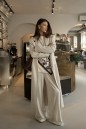 Жакет прямого свободного кроя, выполнен из имитации замши. Характеристики: прямой крой, подкладка, подплечники, отложной воротник, V образный вырез горловины, застежка центральная на две петли пуговицы, рукав втачной, по переду карманы с клапаном, в среднем шве заднего полотна изделия разрез 58 см. Длина изделия 131 см, длина рукава 64 см.