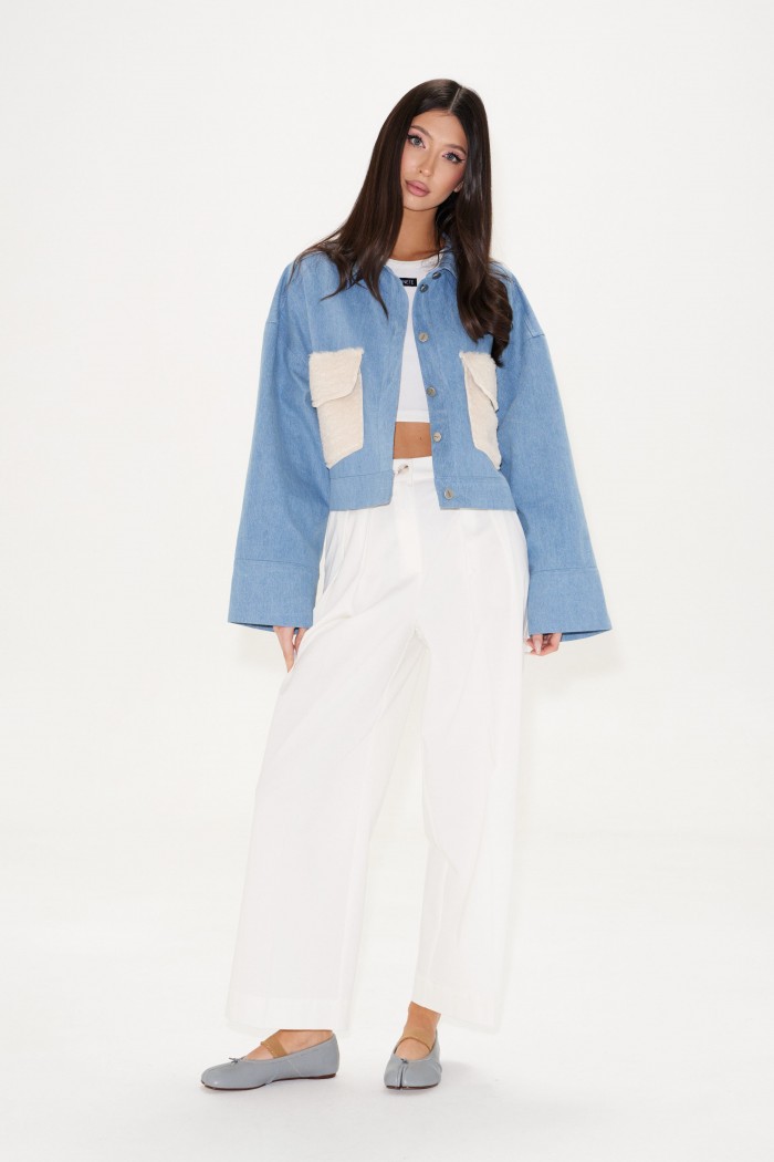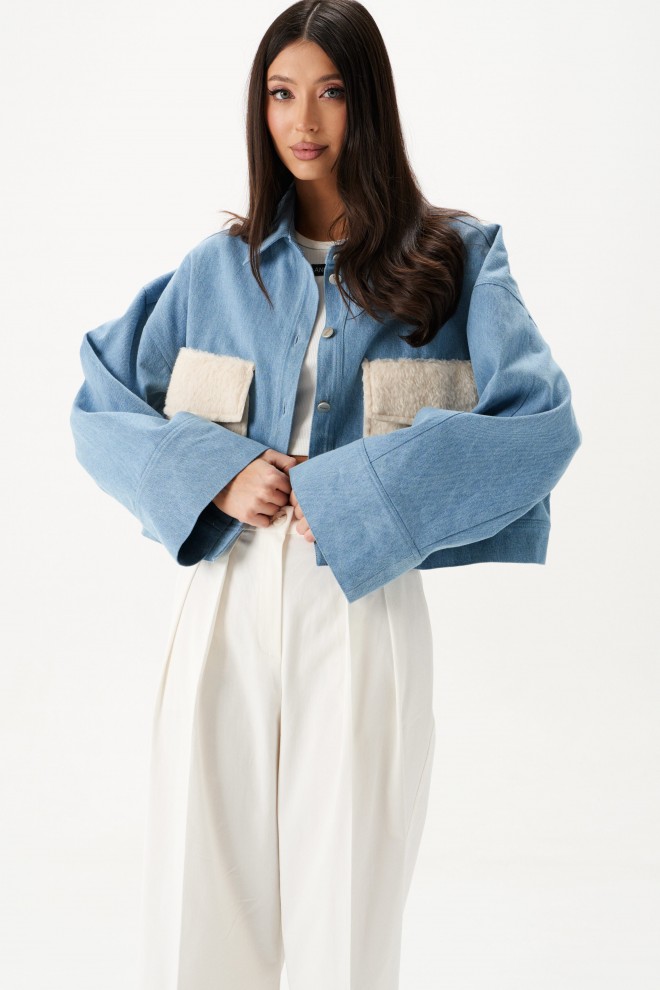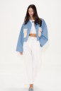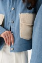 Жакет укороченный. Выполнен из джинсовой ткани голубого цвета. Отложной воротник. Рукав втачной, немного спущен, с широкой манжетой без застёжки. По переду накладные карманы с клапаном из эко-меха в молочном цвете. Застёжка центральная - пуговицы. По низу изделия отрезная планка-пояс, на планке хлястик с кнопками. Спинка отрезная, с фигурной кокеткой. Длина рукава от линии втачивания 52 см. Длина спинки 46,5 см