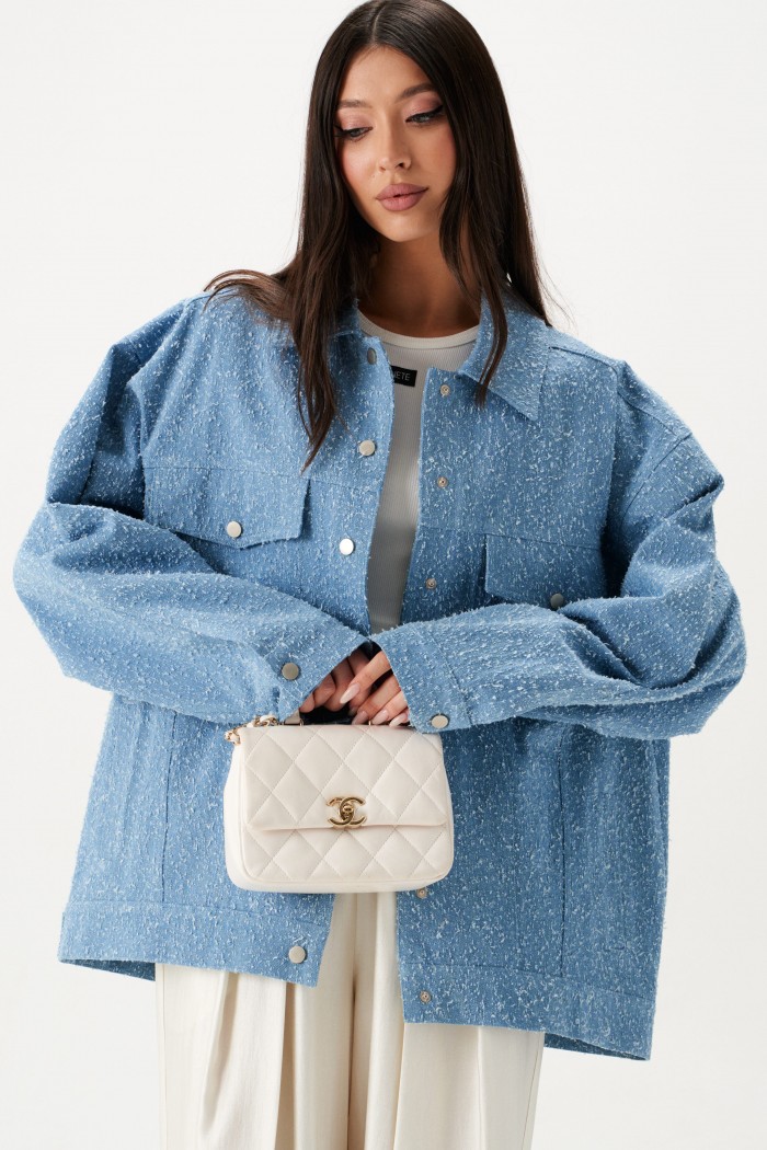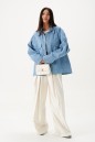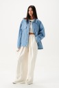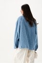 Жакет-куртка. Выполнен из джинсовой ткани голубого цвета с потертостями. Без подкладки. Воротник отложной. Рукав втачной, немного спущен, по низу рукава манжета с застёжкой - кнопка. Верх изделия отрезной - кокетка сзади, кокетка спереди. По низу отрезная планка-пояс. Застёжка в изделии центральная - кнопки. На уровне линии груди карманы с клапаном, на поясе хлястик с кнопкой, по бокам прорези для карманов. Внизу изделия прорезные карманы с листочкой. Длина рукава от линии втачивания 53 см. Длина спинки 65 см