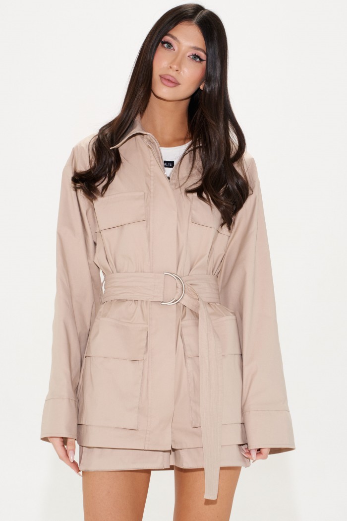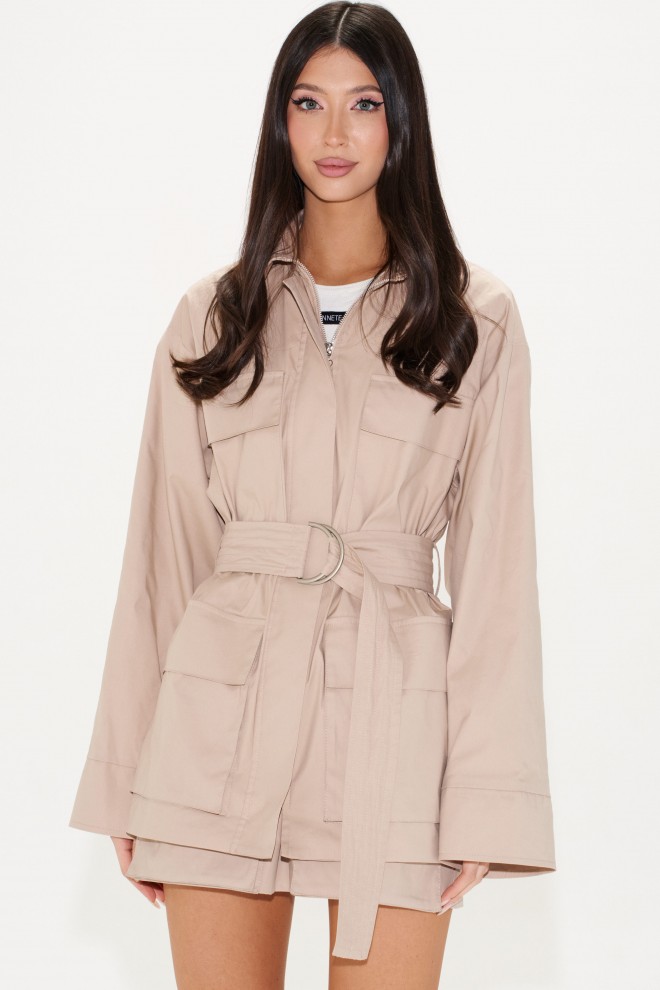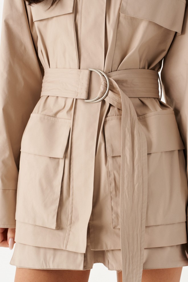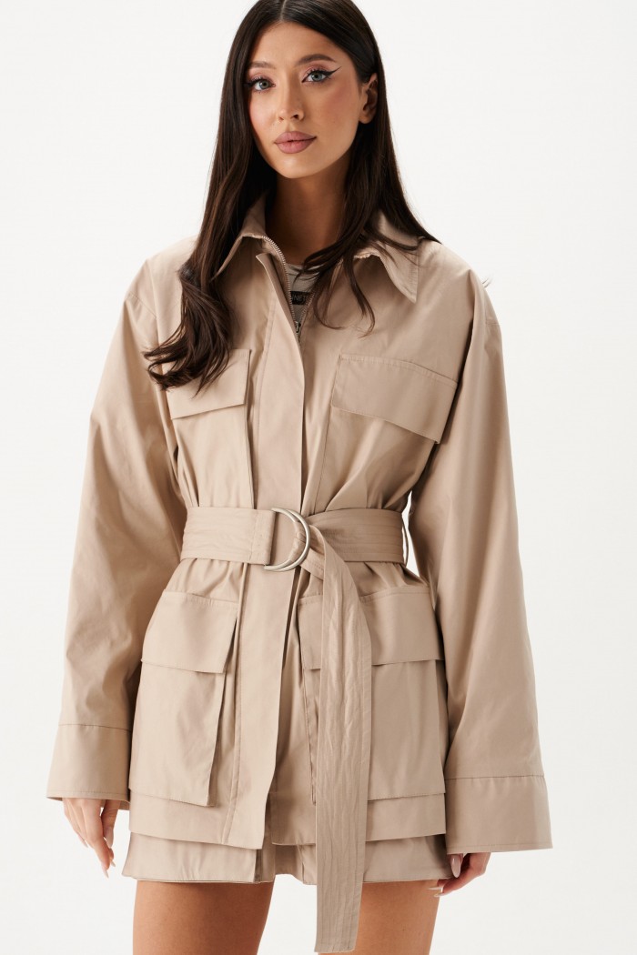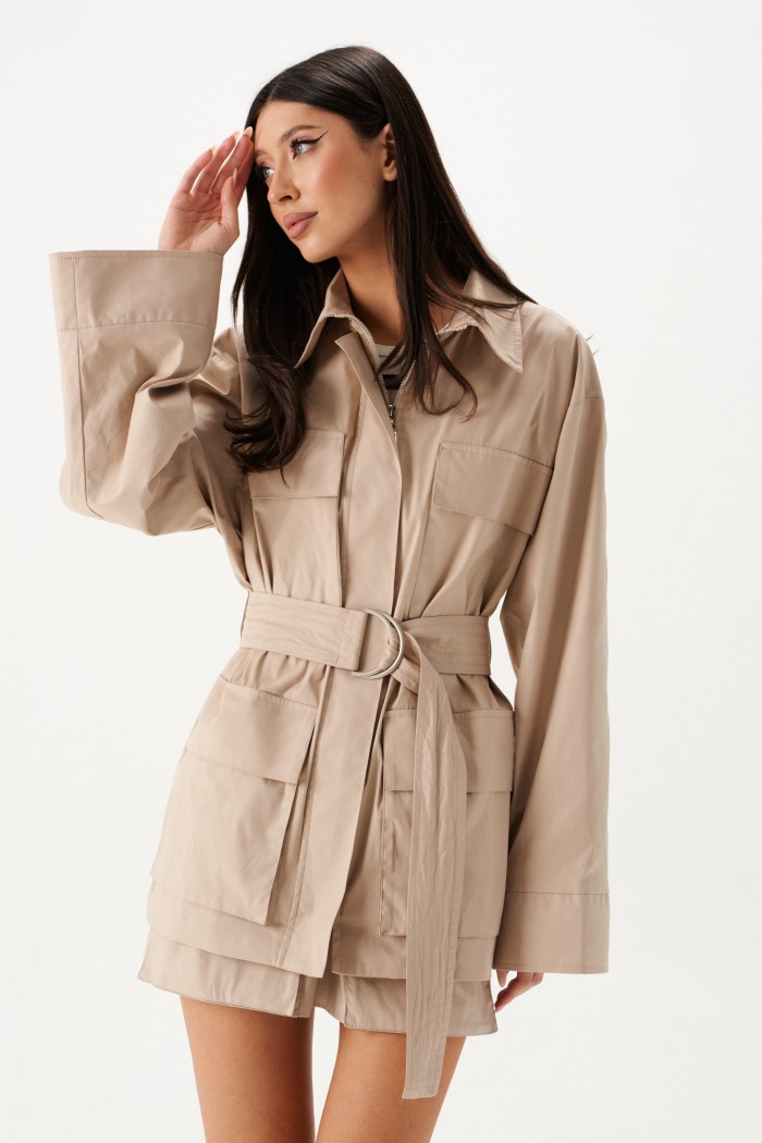 Жакет прямого кроя выполнен из текстильной ткани песочного цвета с брендированным подкладом. Характеристики: прямой крой, подкладка, отложной воротник, по переду крупные накладные карманы, застёжка центральная на молнии прикрытая планкой, по линии талии шлевки, в комплекте пояс из ткани основного изделия, рукав свободный прямого кроя. Длина изделия 71 см, длина рукава 59 см.