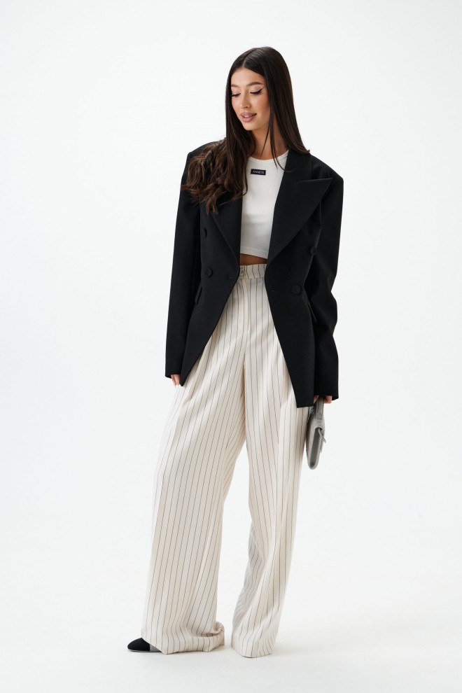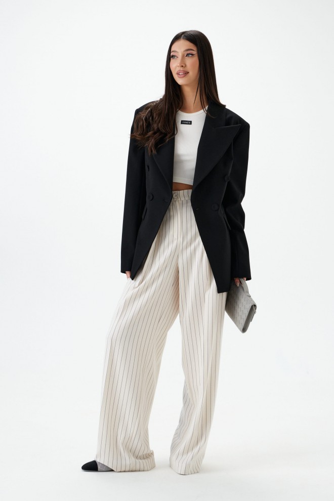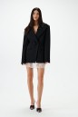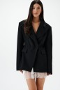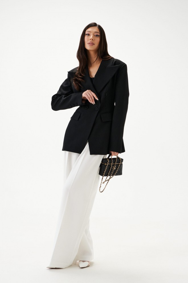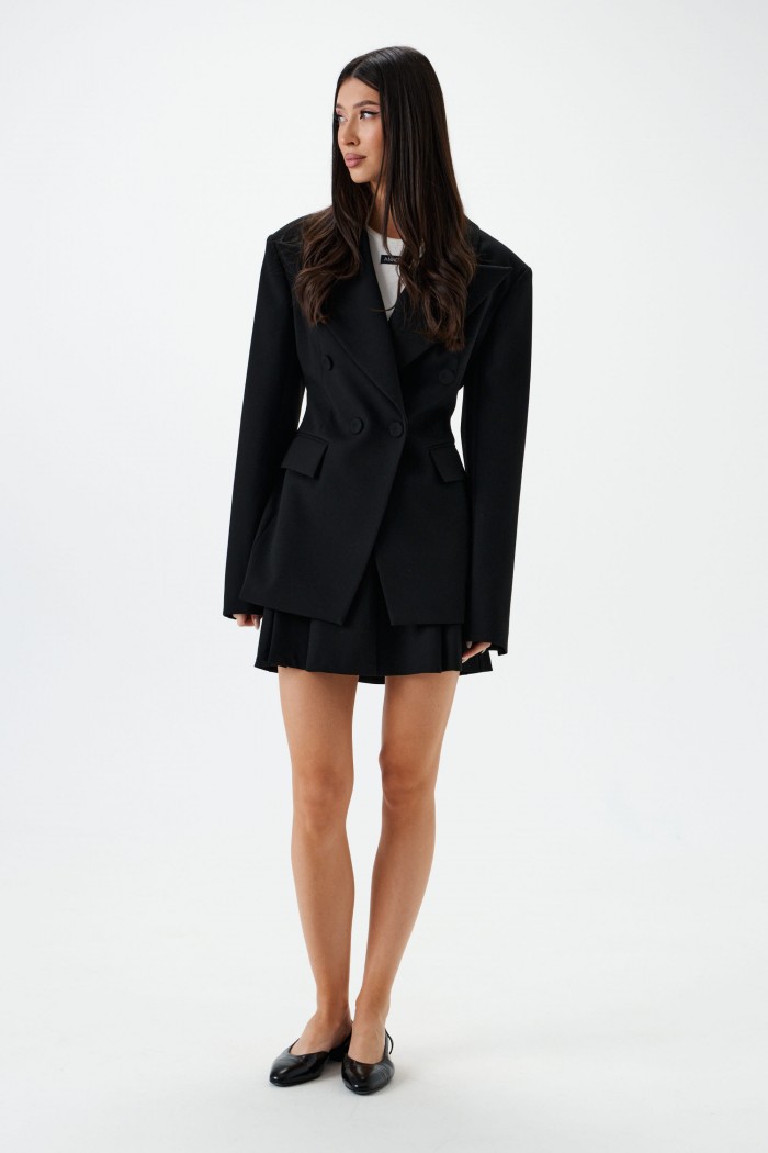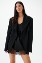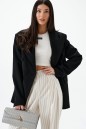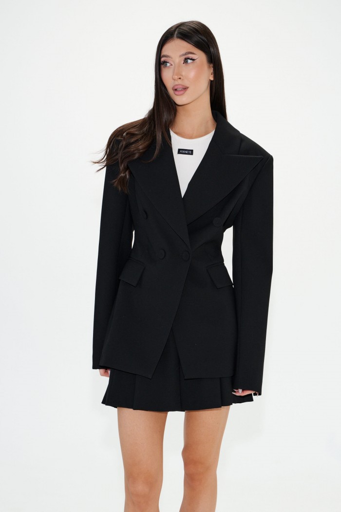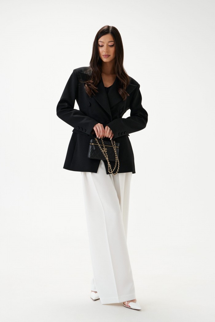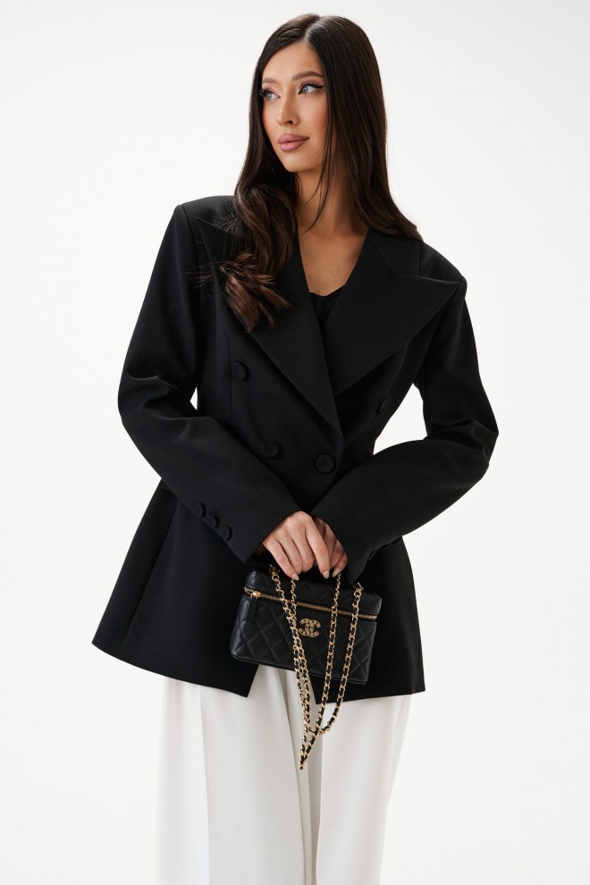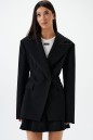 Жакет приталенного силуэта. Выполнен из текстильной ткани. С подкладкой. Воротник пиджачного типа с лацканами. На переде по линии талии карманы в рамку с клапаном. Рукав втачной. Локтевой шов заканчивается шлицей, с имитацией застегивания на петли и пуговицы. Застежка центральная на петли и пришивные пуговицы. Длина изделия 72см, длина рукава 64см.