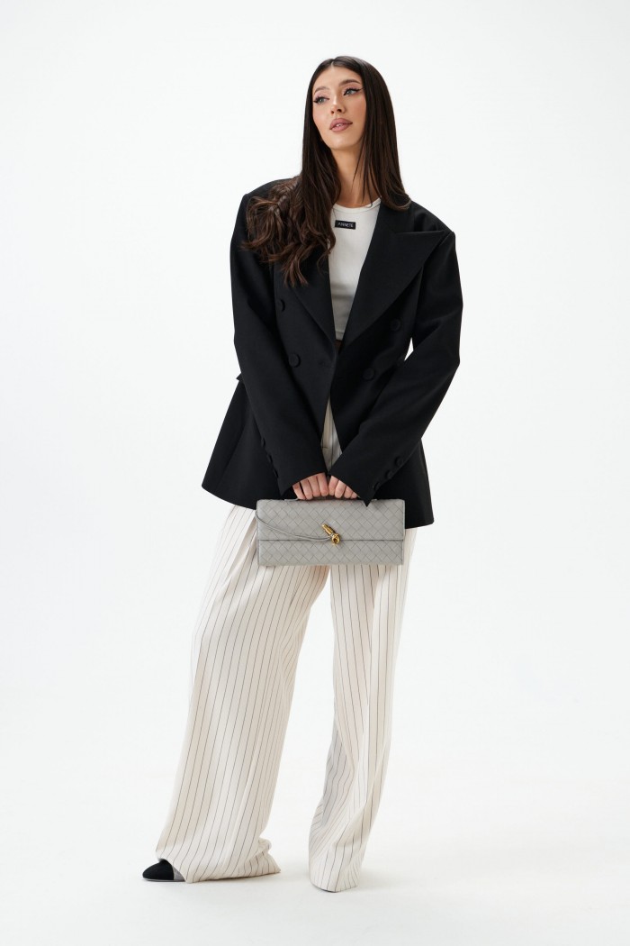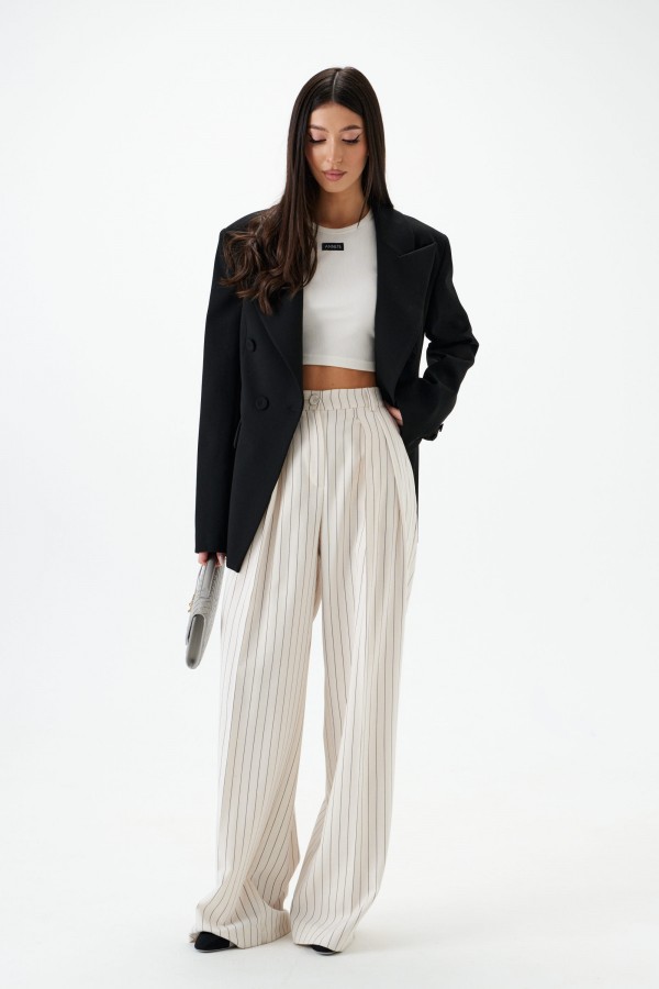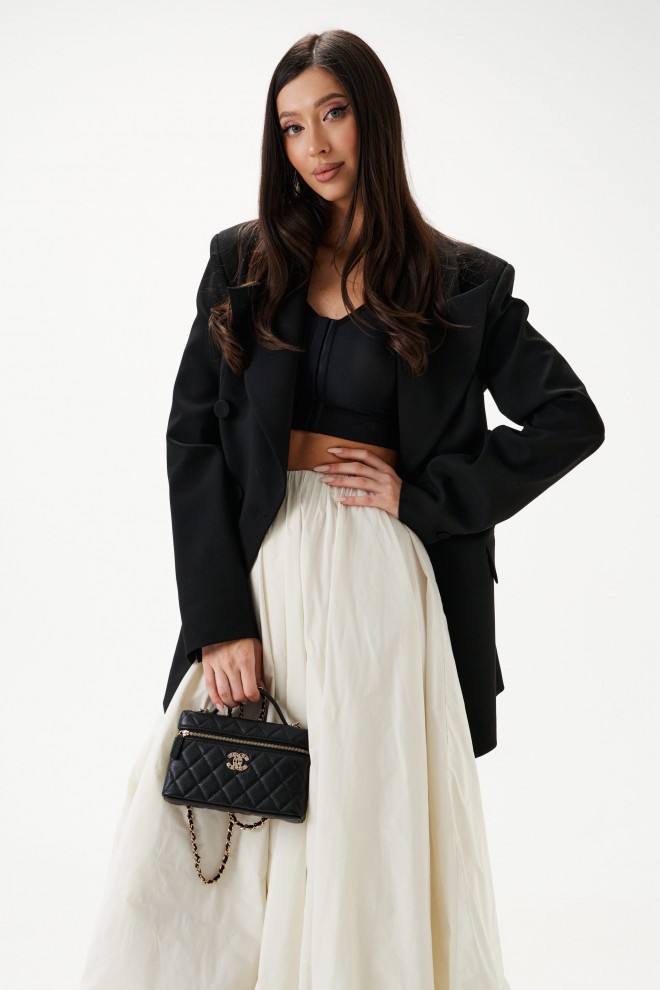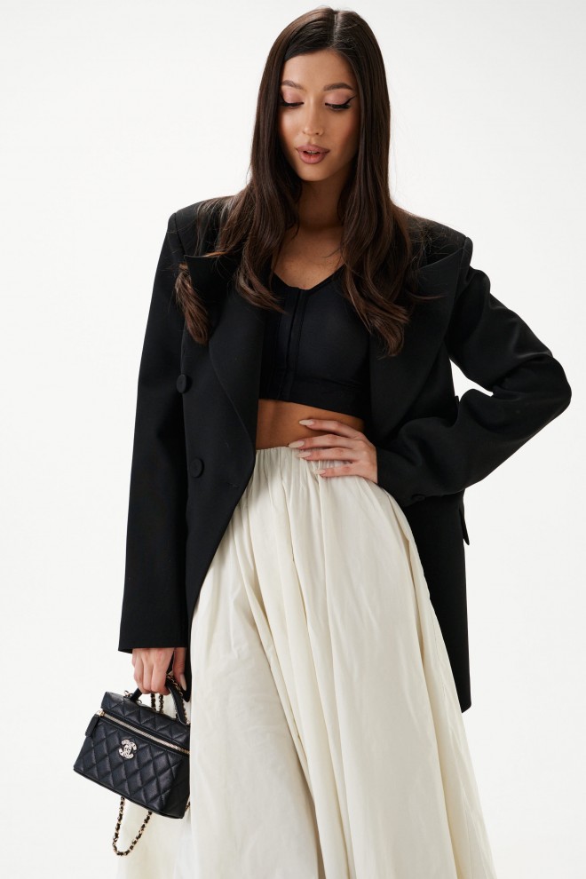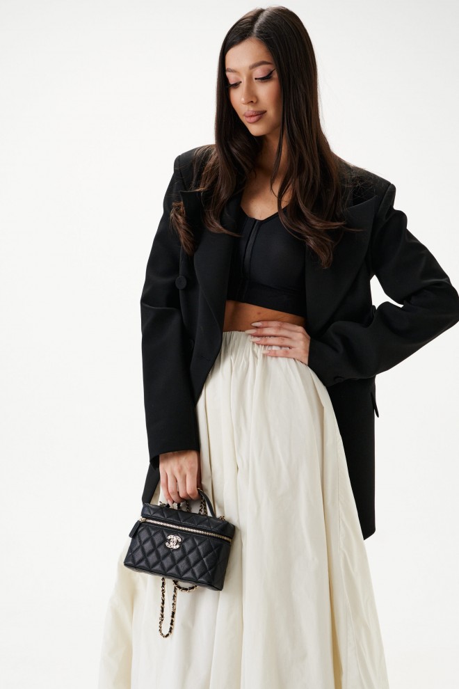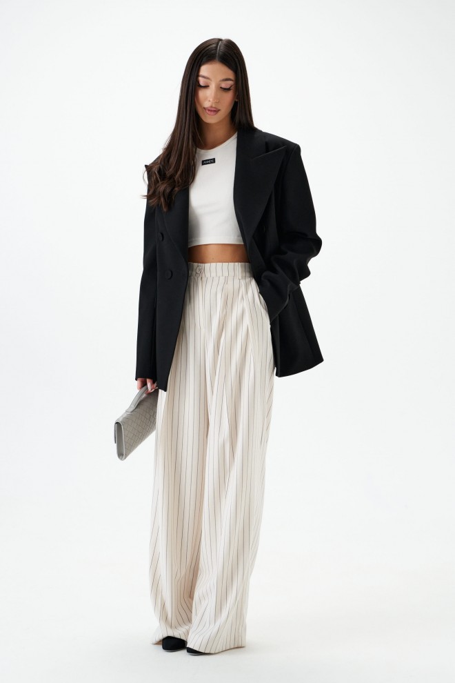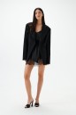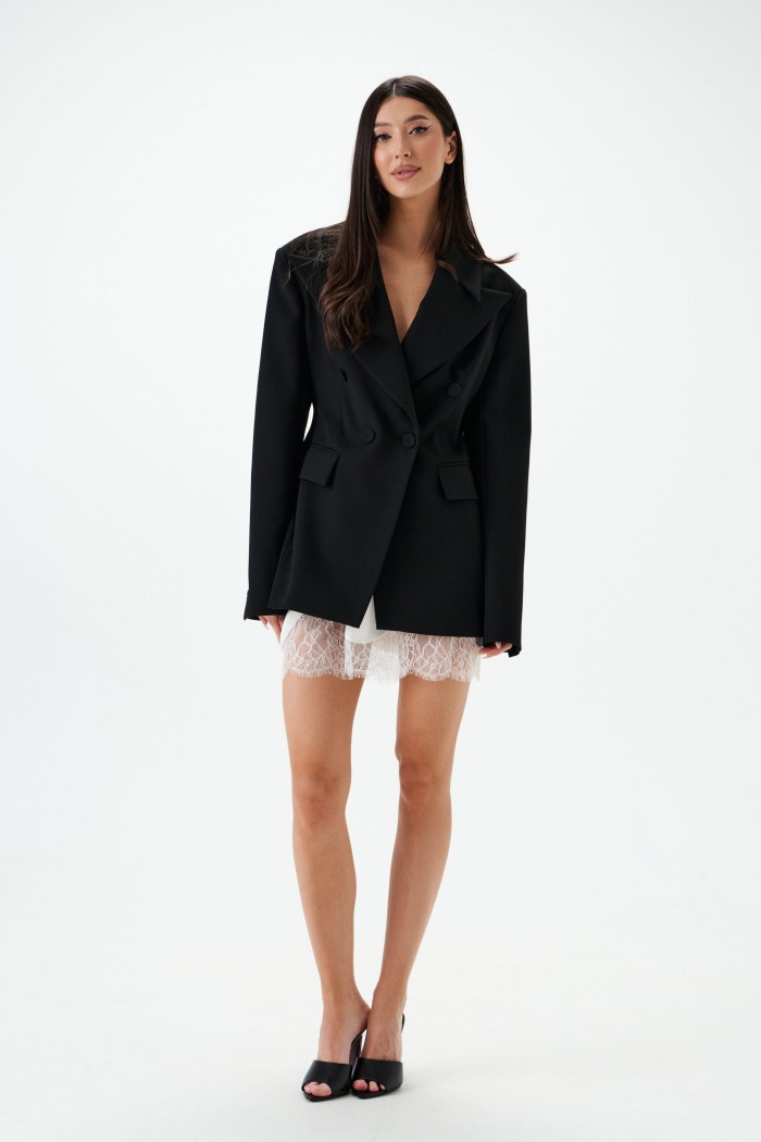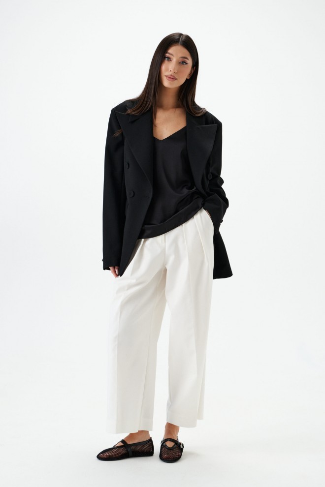 Жакет приталенного силуэта. Выполнен из текстильной ткани. С подкладкой. Воротник пиджачного типа с лацканами. На переде по линии талии карманы в рамку с клапаном. Рукав втачной. Локтевой шов заканчивается шлицей, с имитацией застегивания на петли и пуговицы. Застежка центральная на петли и пришивные пуговицы. Длина изделия 72см, длина рукава 64см.