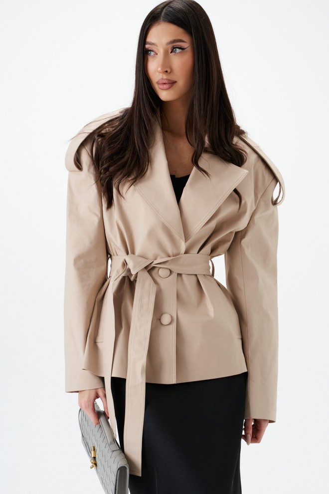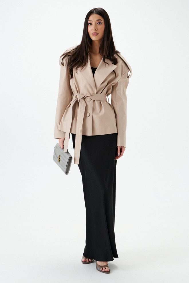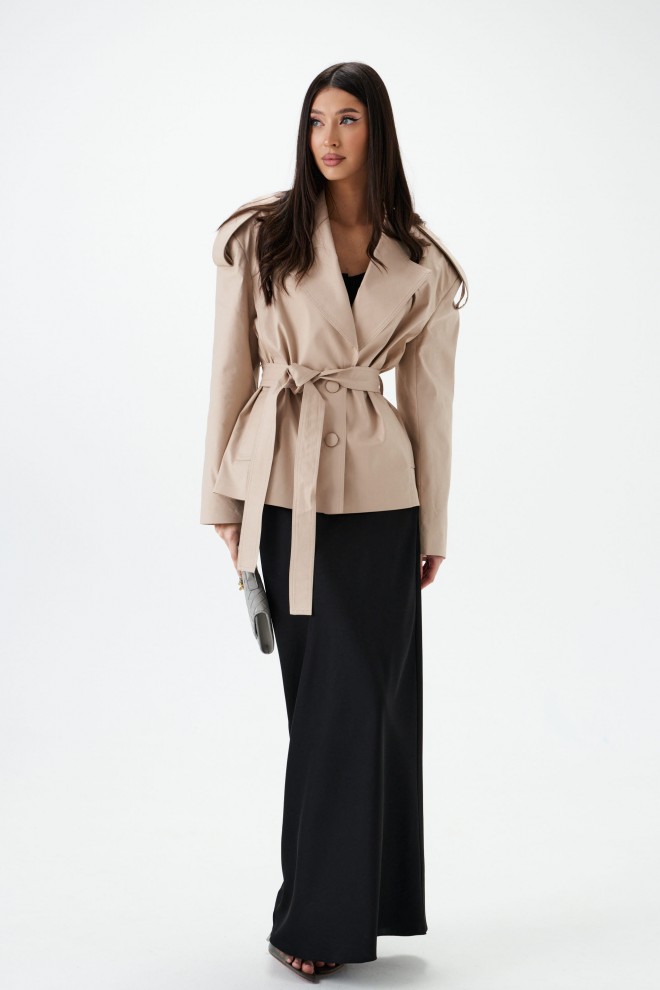 Жакет прямого кроя выполнен из полотна бежевого цвета. Характеристики: прямой крой, покладка, подплечники, отложной воротник с остроугольным лацканом, застежка центральная на петли пуговицы, по линии талии шлевки, в комплекте пояс из ткани основного изделия, рукав втачной. По линии плеча погон с пуговицей, в среднем шве заднего полотна изделия шлица 17 см. В боковых швах изделия карманы. Длина по спинке 65 см, длина рукава 58 см.