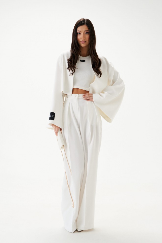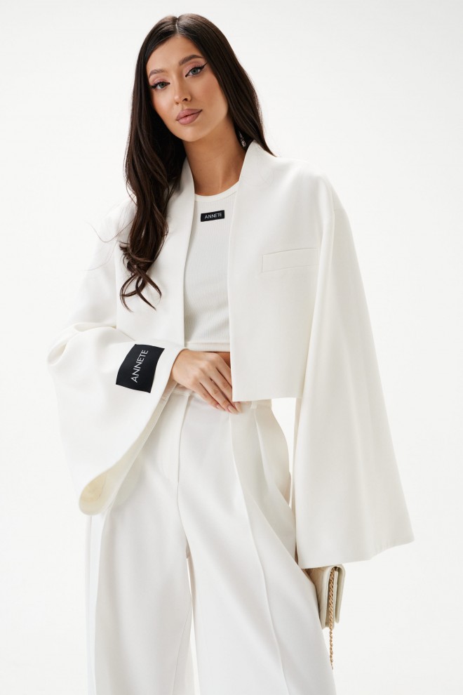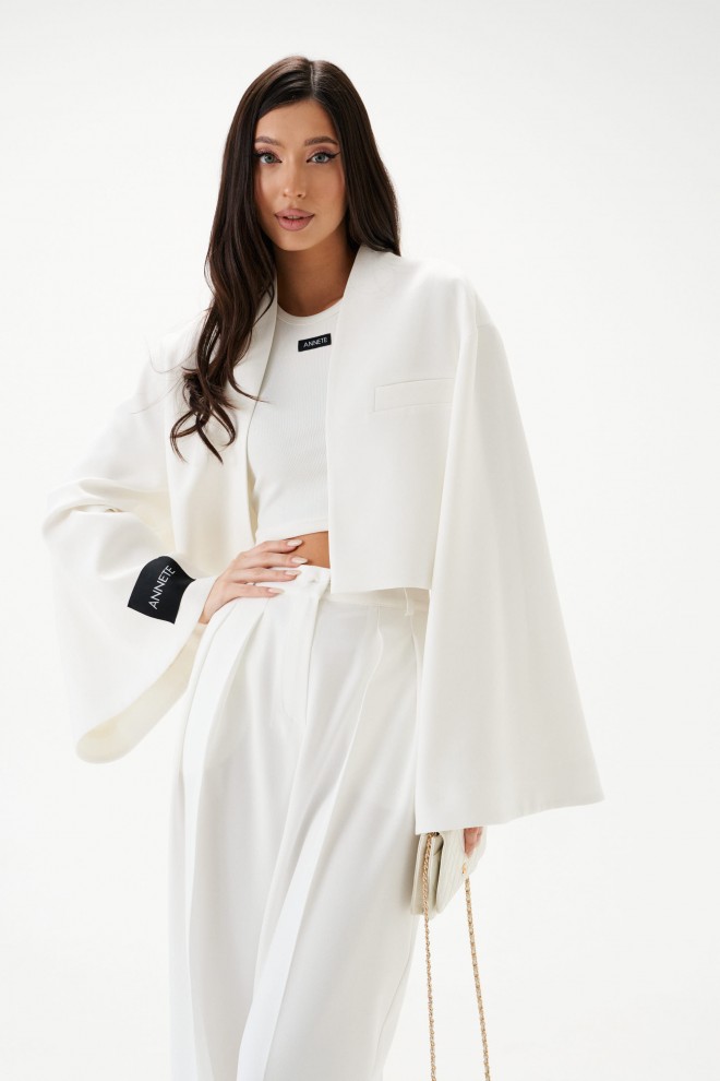 Жакет прямого свободного кроя белого цвета. Воротник стойка переходяший в V-образный вырез, подкладка. Широкие спущеные рукава, на правом рукаве нашивка Annete. Без застёжки. По переду карман-листочка (нефункциональный). Длина по спинке 42 см, длина рукава от горловины 75 см.