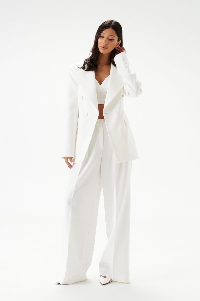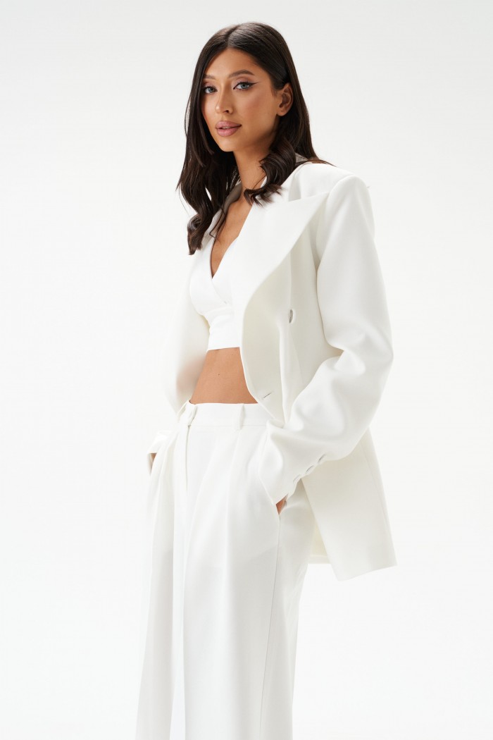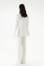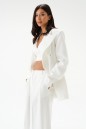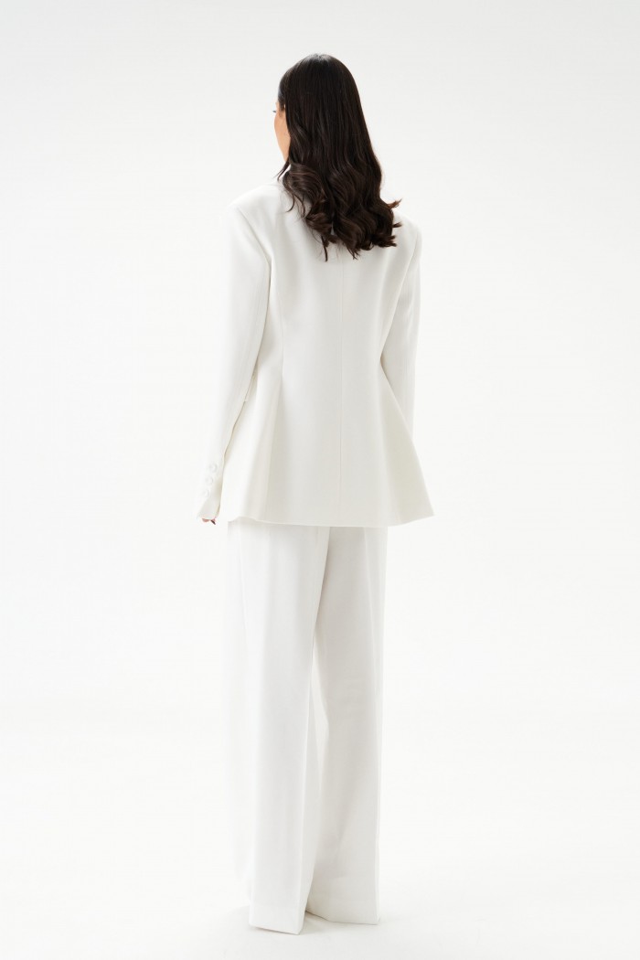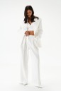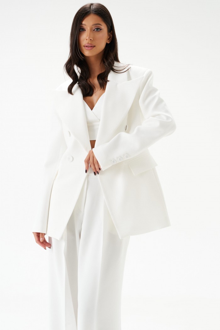 Жакет приталенного силуэта. Выполнен из текстильной ткани. С подкладкой. Воротник пиджачного типа с лацканами. На переде по линии талии карманы в рамку с клапаном. Рукав втачной. Локтевой шов заканчивается шлицей, с имитацией застегивания на петли и пуговицы. Застежка центральная на петли и пришивные пуговицы. Длина изделия 72см, длина рукава 64см.