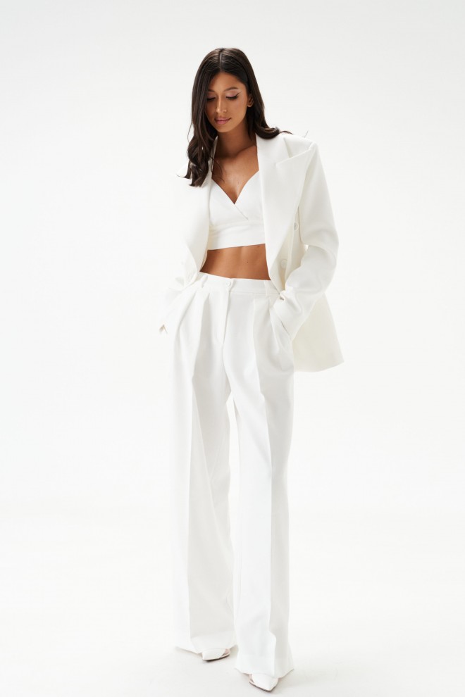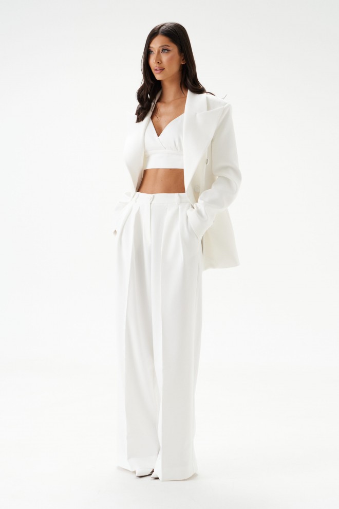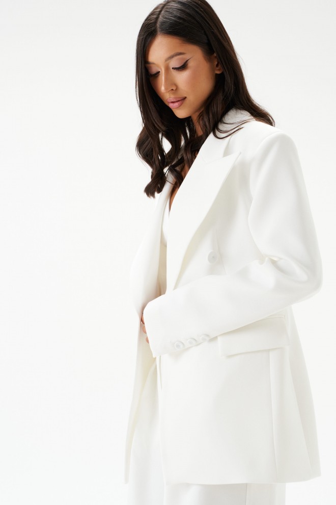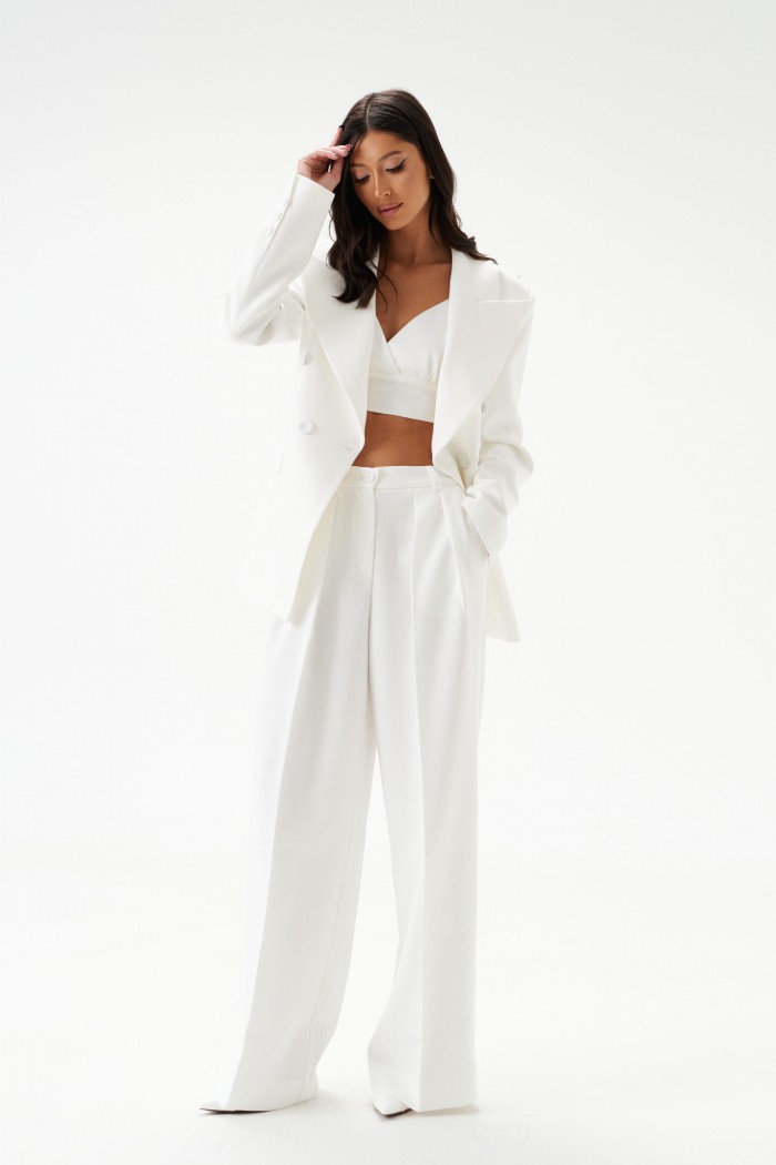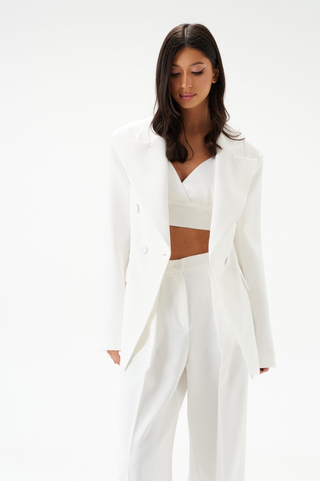 Жакет приталенного силуэта. Выполнен из текстильной ткани. С подкладкой. Воротник пиджачного типа с лацканами. На переде по линии талии карманы в рамку с клапаном. Рукав втачной. Локтевой шов заканчивается шлицей, с имитацией застегивания на петли и пуговицы. Застежка центральная на петли и пришивные пуговицы. Длина изделия 72см, длина рукава 64см.