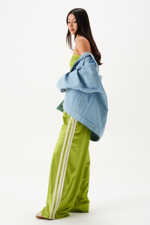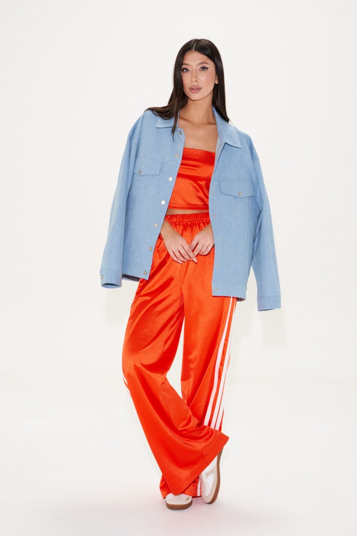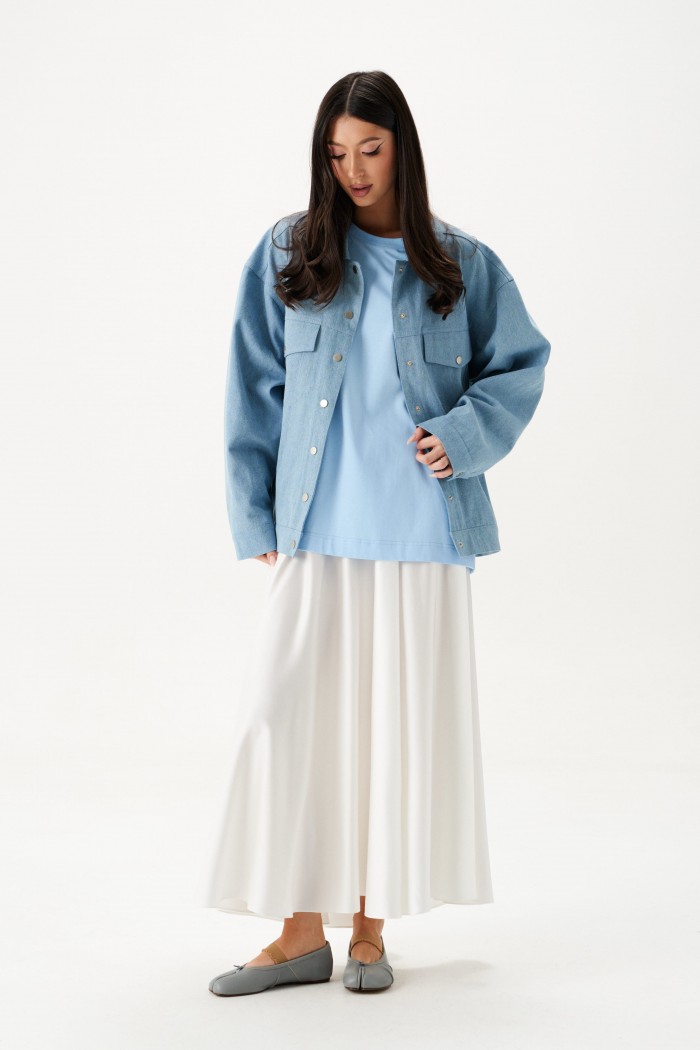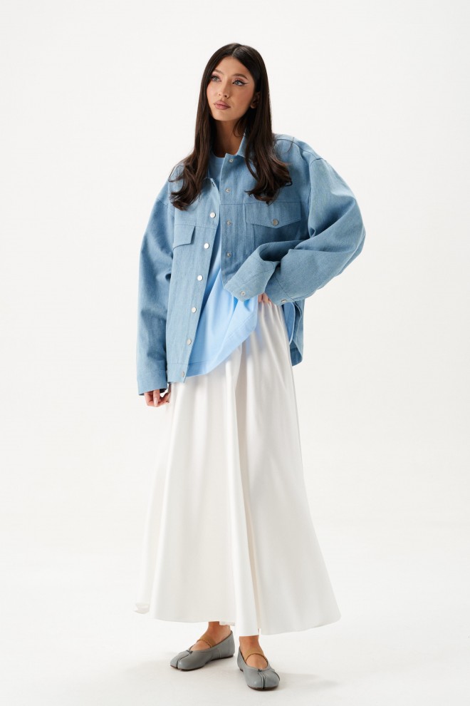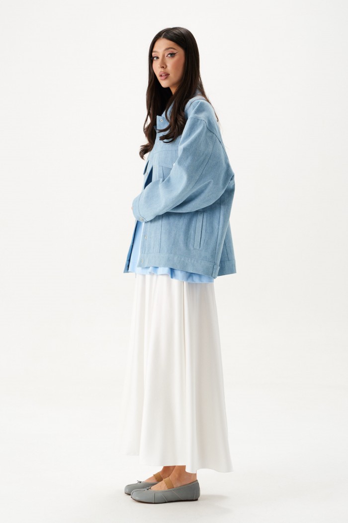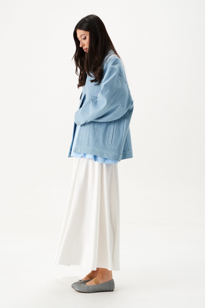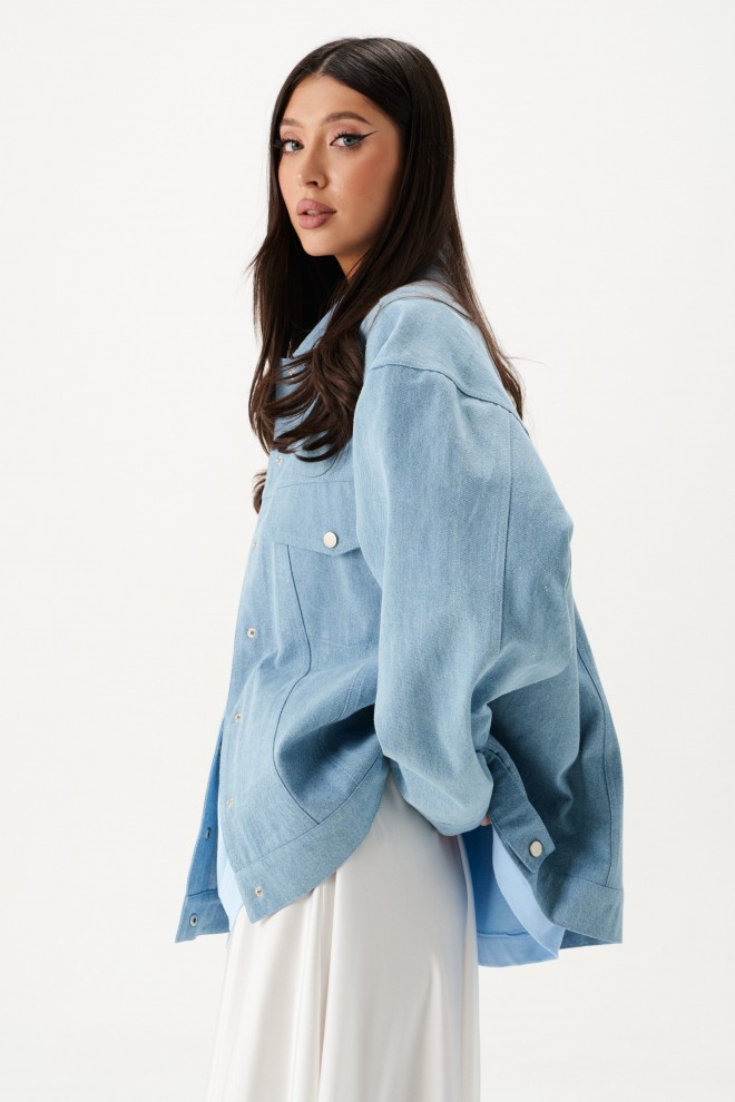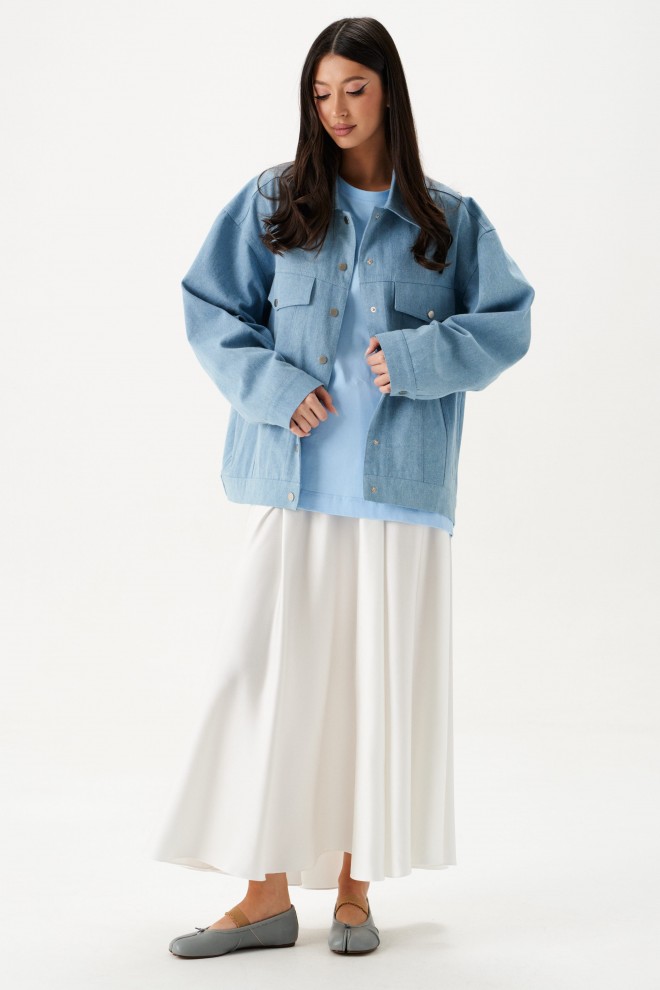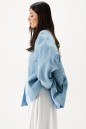 Куртка-жакет. Выполнена из джинсовой ткани голубого цвета. Без подкладки. Воротник отложной. Рукав втачной, немного спущен, по низу рукава манжета с застёжкой - кнопка. Верх изделия отрезной - кокетка сзади, кокетка спереди. По низу отрезная планка-пояс, на поясе хлястик с кнопкой. Застёжка в изделии центральная - кнопки. На уровне линии груди карманы с клапаном. Внизу изделия прорезные карманы с листочкой. По спинке нашита декоративная деталь из ворсистой ткани – крупное сердце. Длина рукава от линии втачивания 53 см. Длина спинки 65 см