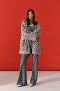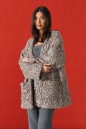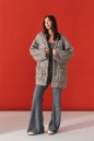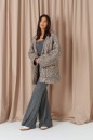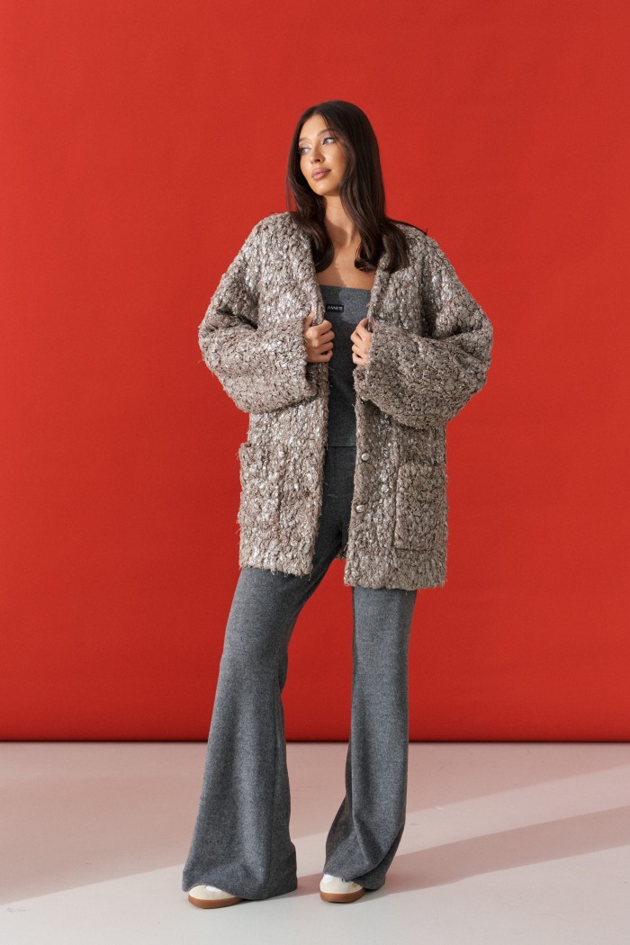 Жакет (кардиган) прямого свободного кроя. Выполнен из мягкой фактурной ткани тёмного-бежевого цвета с серебристым напылением. С подкладкой. Вырез горловины V-образный. Рукав втачной, спущен. По переду накладные карманы. Застёжка центральная пуговицы. Длина спинки 80 см. Длина рукава от линии втачивания 52 см (длина рукава от горловины 79 см)