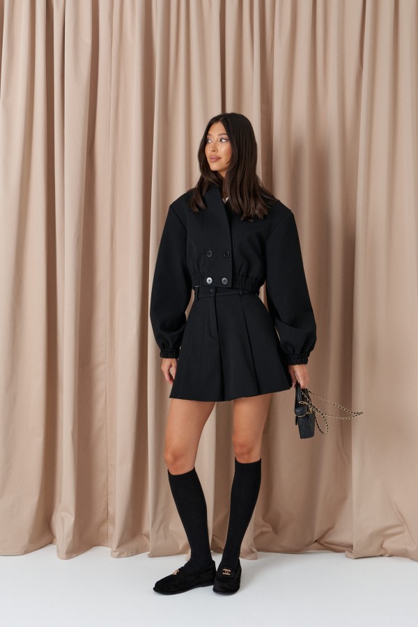 Жакет прямого свободного кроя выполнен из костюмной ткани черного цвета. Характеристики: прямой свободный крой, подкладка, подплечники, воротник с остроугольным лацканом, застежка центральная на петлю - пуговицу, по переду функциональные карманы с клапаном, рукав втачной, по низу рукава нашиты пуговички, спинка со средним швом, в среднем шве разрез 27 см. Длина по спинке 76, длина рукава 63 см.