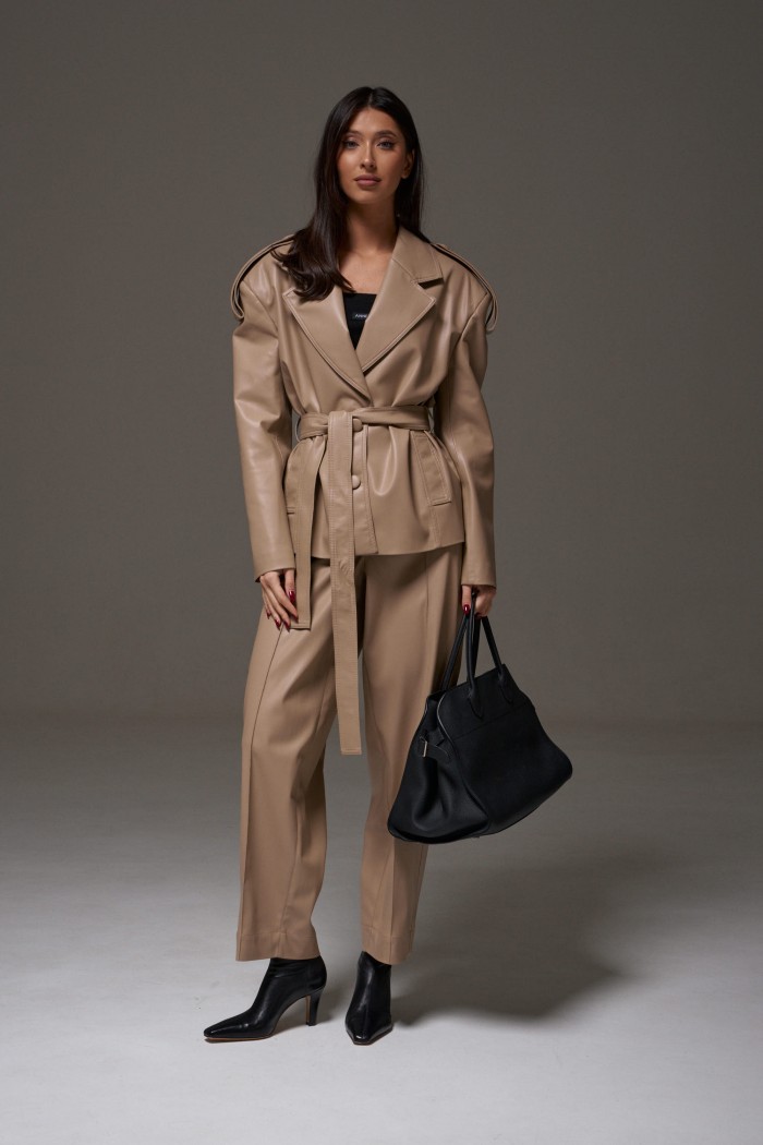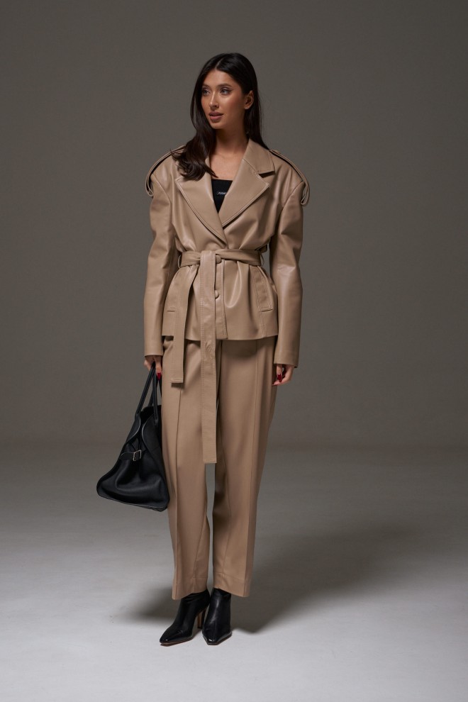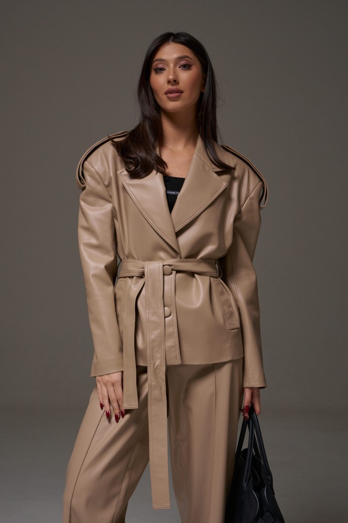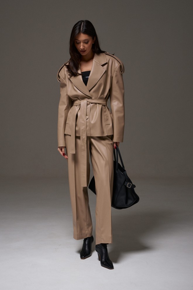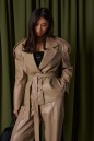 Куртка прямого кроя выполнен из эко-кожи бежевого цвета. Характеристики: прямой крой, брендированная покладка, подплечники, отложной воротник с остроугольным лацканом, застежка центральная на петли пуговицы, по линии талии шлевки, в комплекте пояс из ткани основного изделия, рукав втачной. По линии плеча погон с пуговицей, в среднем шве заднего полотна изделия шлица 17 см. В боковых швах изделия карманы. Длина по спинке 65 см, длина рукава 58 см.