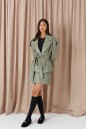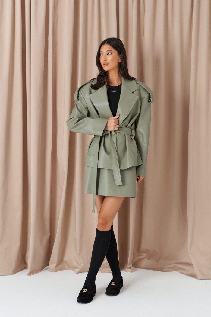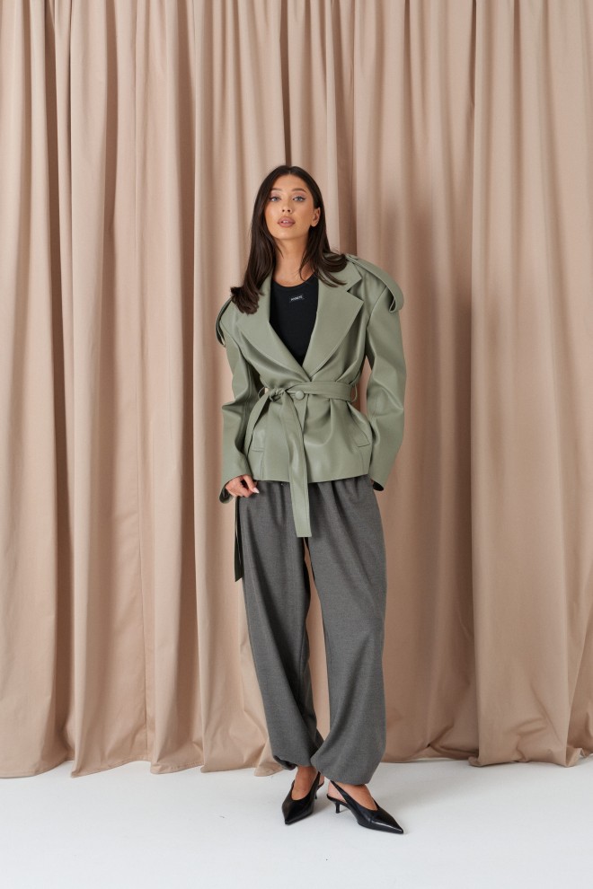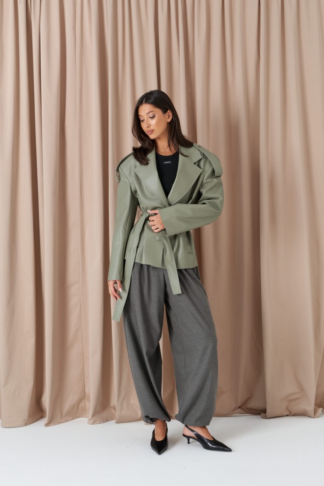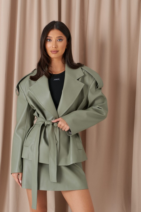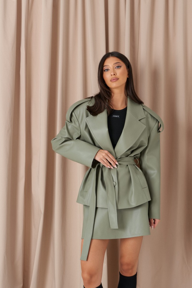 Куртка прямого кроя выполнен из эко-кожи эвкалиптового цвета. Характеристики: прямой крой, брендированная покладка, подплечники, отложной воротник с остроугольным лацканом, застежка центральная на петли пуговицы, по линии талии шлевки, в комплекте пояс из ткани основного изделия, рукав втачной. По линии плеча погон с пуговицей, в среднем шве заднего полотна изделия шлица 17 см. В боковых швах изделия карманы. Длина по спинке 65 см, длина рукава 58 см.