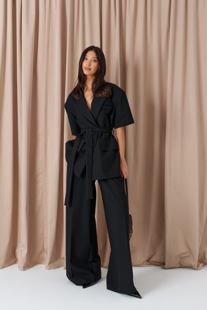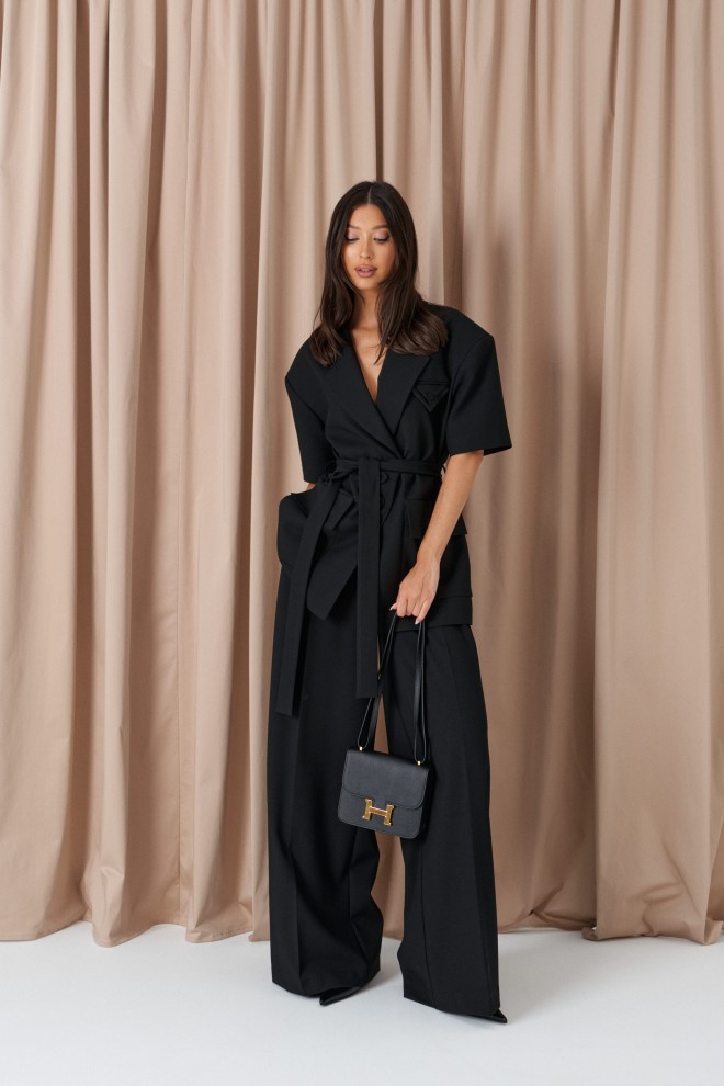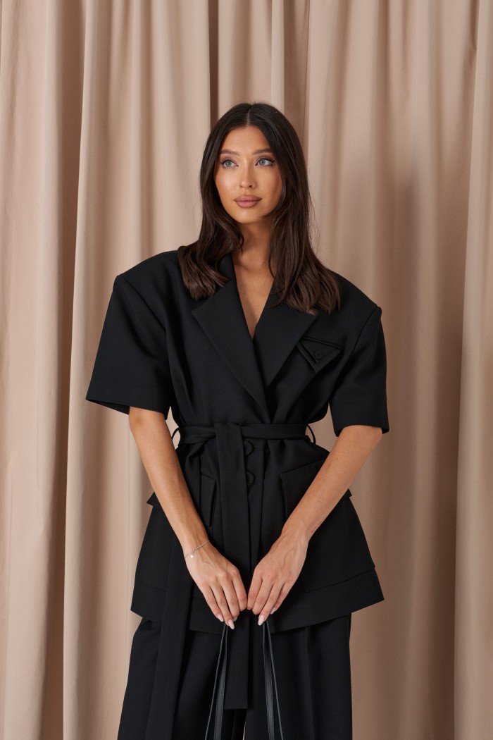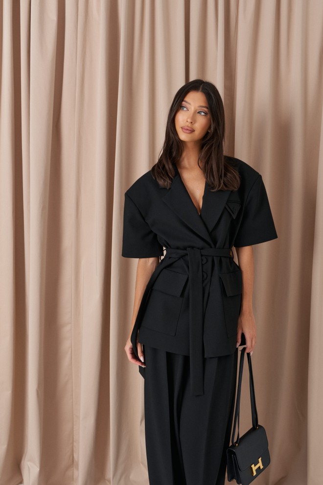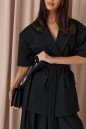 Жакет прямого кроя. Выполнен из костюмной ткани черного цвета. Брендированная подкладка. Воротник пиджачного типа с лацканами. Рукав втачной, линия плеча расширена. Застёжка центральная на пуговицах. По переду накладные карманы с клапаном, нагрудный карман с декоративным платочком. Шлёвки, пояс из ткани основного изделия. Длина рукава от линии втачивания 23 см. Длина спинки 75 см.