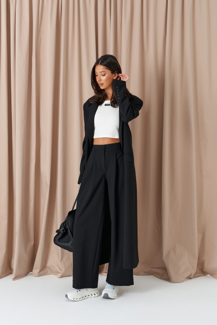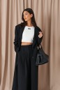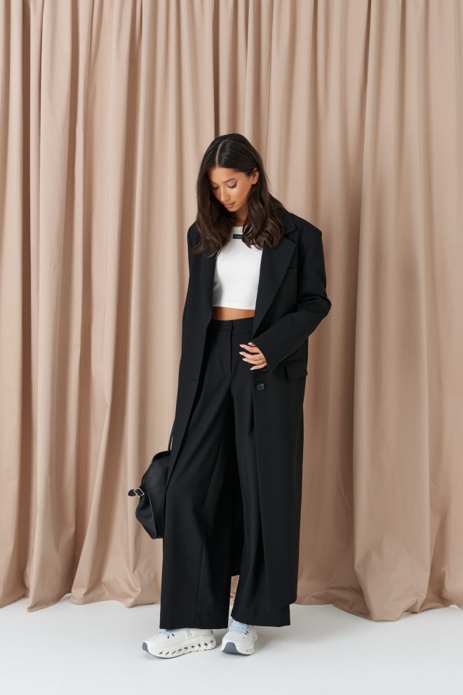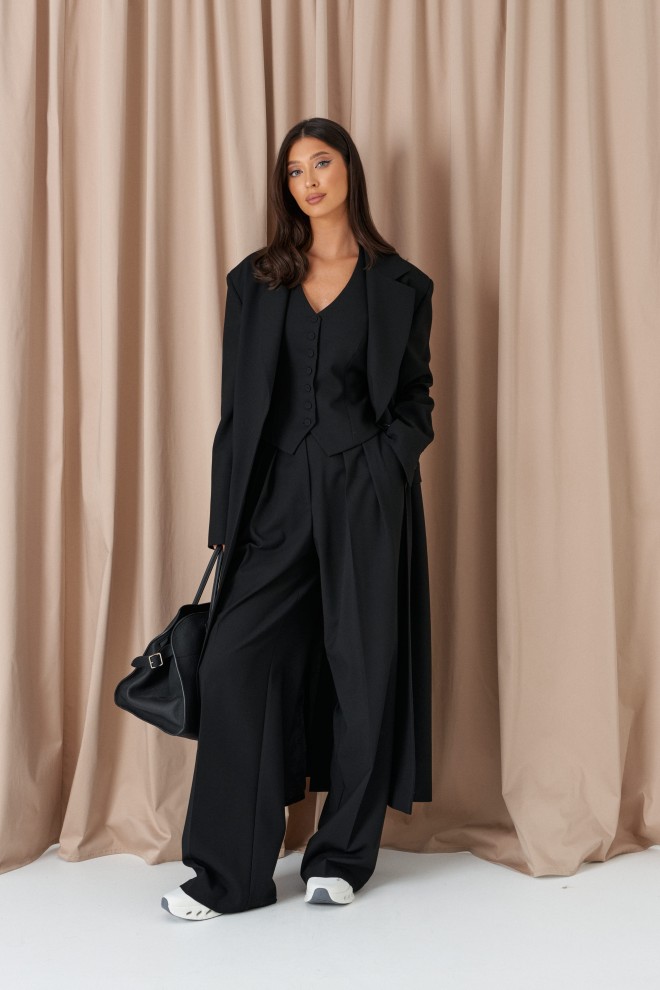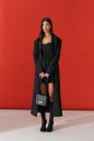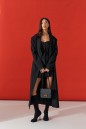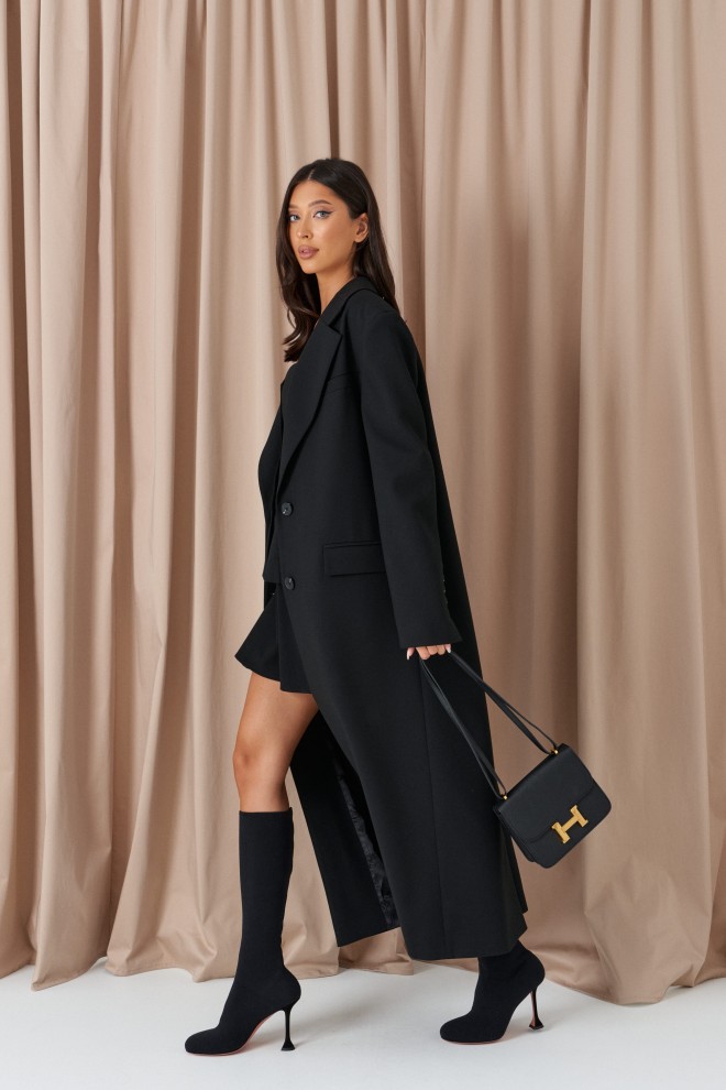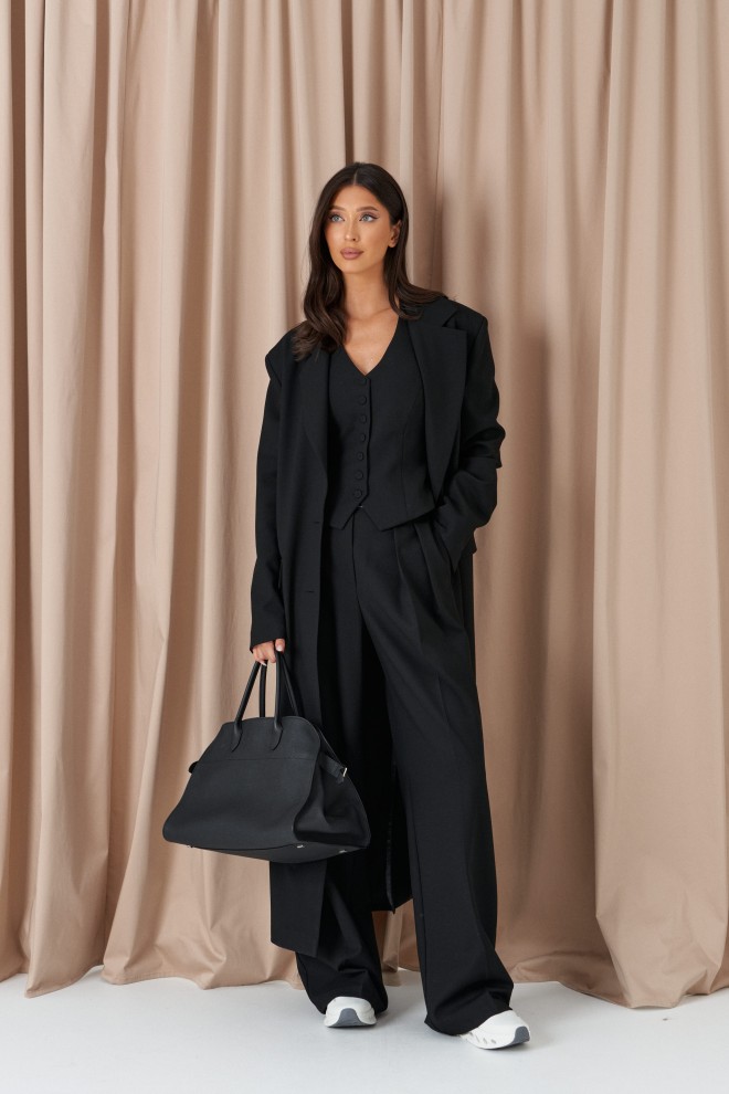 Жакет прямого свободного кроя, выполнен из костюмной ткани черного цвета. V-образный вырез горловины, отложной воротник, застежка центральная на две петли пуговицы. Брендированная подкладка, подплечники. Рукав втачной. По переду карманы с клапаном, в среднем шве заднего полотна изделия разрез 58 см. Длина изделия 131 см, длина рукава 64 см.