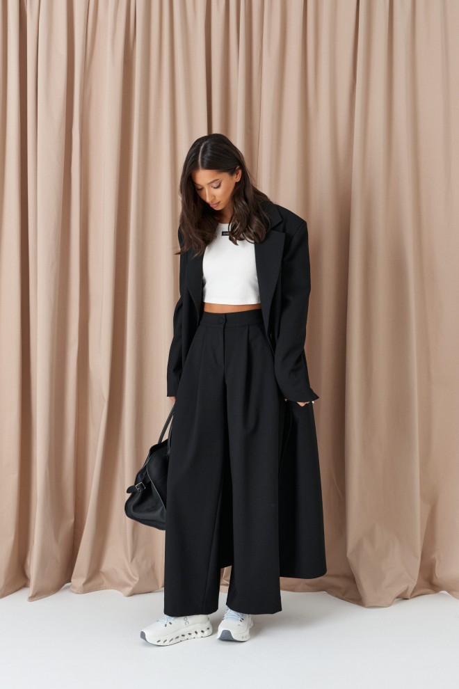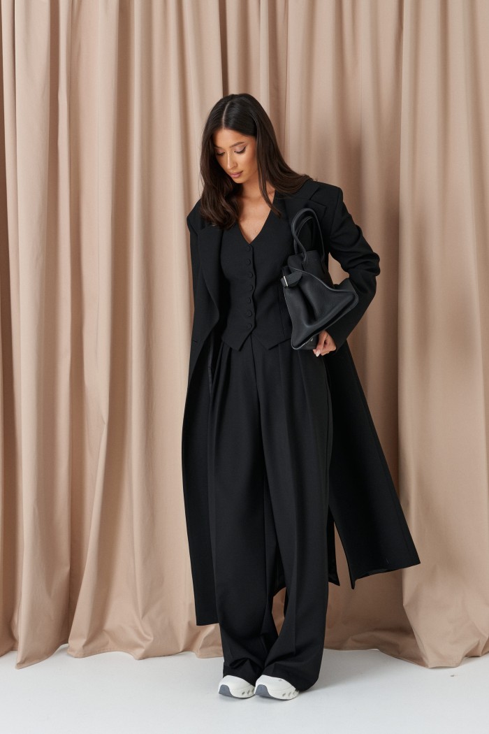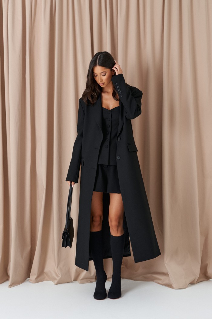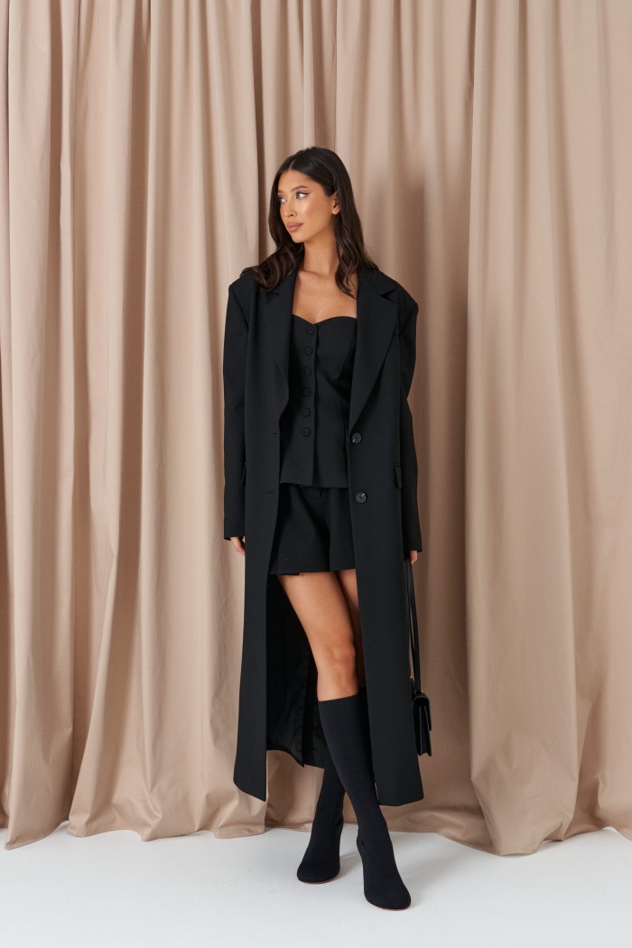 Жакет прямого свободного кроя, выполнен из костюмной ткани черного цвета. V-образный вырез горловины, отложной воротник, застежка центральная на две петли пуговицы. Брендированная подкладка, подплечники. Рукав втачной. По переду карманы с клапаном, в среднем шве заднего полотна изделия разрез 58 см. Длина изделия 131 см, длина рукава 64 см.