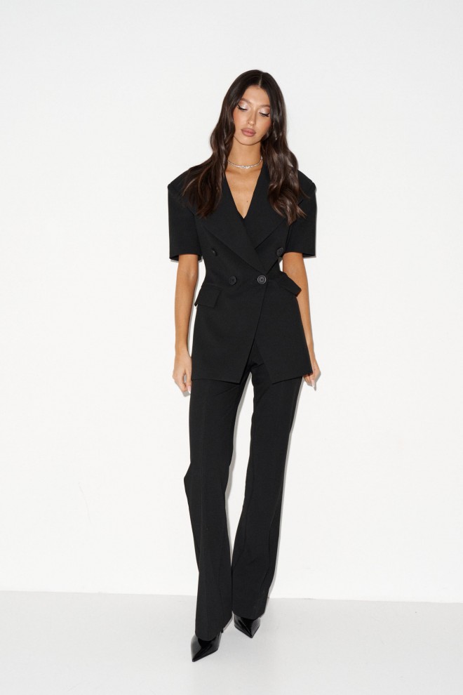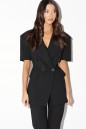 Жакет двубортный, полуприталленого силуэта. Выполнен из костюмной ткани чёрного цвета. Характеристика: отложной воротник с остроугольными геометрическими лацканами, вточной рукав, подклад, подплечники, талиевые выточки по переду, отрезная боковая планка, по переду изделия карманы-листочки, талиевые вытачки по спинке, брендированная подкладка. Длина рукава 24 см. Длина спинки от края горловины 72 см.
