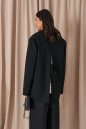 Жакет прямого свободного кроя выполнен из костюмной ткани черного цвета. Характеристики: прямой свободный крой, подкладка, подплечники, воротник с остроугольным лацканом, застежка центральная на петлю - пуговицу, по переду функциональные карманы с клапаном, на груди прорезной карман обманка, рукав втачной, спинка со средним швом, в среднем шве разрез 59 см с завязкой-бантом из ткани основоного изделия. Брендированная подкладка. Длина по спинке 76, длина рукава 62 см.