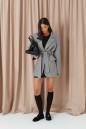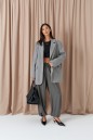 Жакет прямого свободного кроя. Выполнен из шерстяной (смесовой) ткани серого цвета. Характеристика: подкладка, воротник отложной с лацканами, рукав втачной и чуть спущен, по переду карманы с клапанами, застёжка центральная - пуговицы, в среднем шве заднего полотна шлица (29,5 см). В комплекте пояс из ткани основного изделия. Длина спинки 78 см. Длина рукава от линии втачивания 62 см