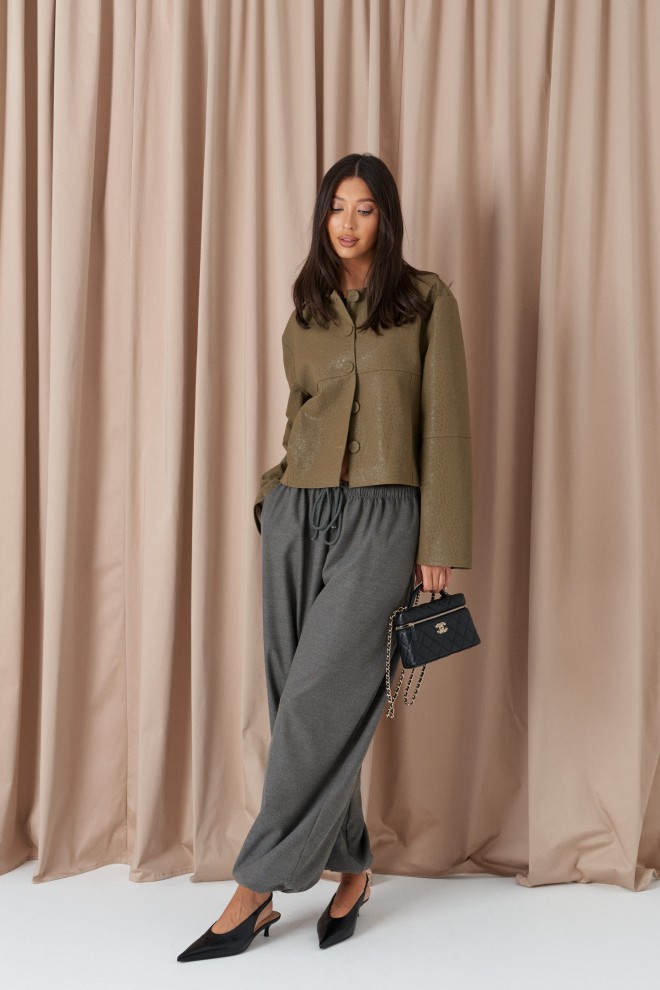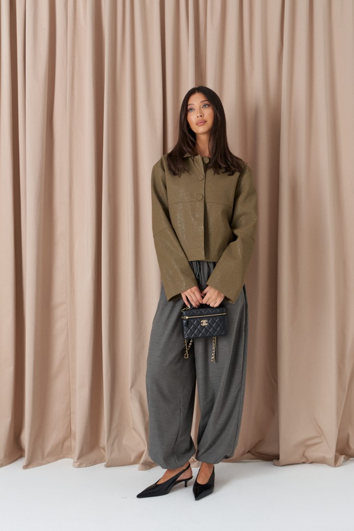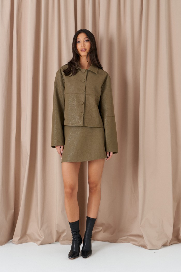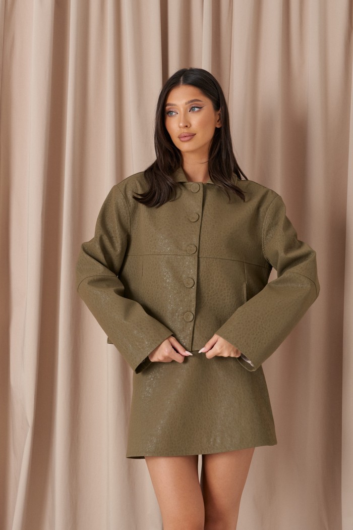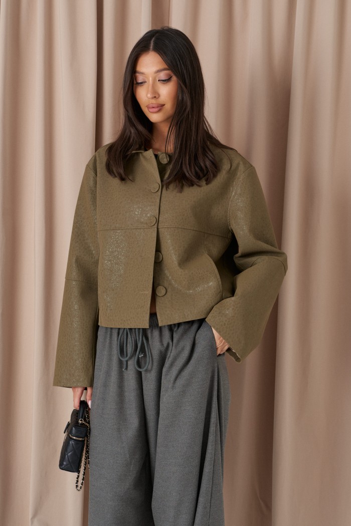 Жакет прямого кроя, выполнен из эко-кожи цвета кахи. характеристика: прямой крой, отложной воротник, центральная застежка на пуговицы, спинка и перед отрезные с вертикальными швами, спереди прорези для карманов, рукав вточной широкий, плечо спущено. Длина по спинке 52см, длина рукава от края горловины 77см.