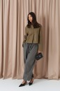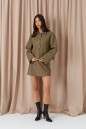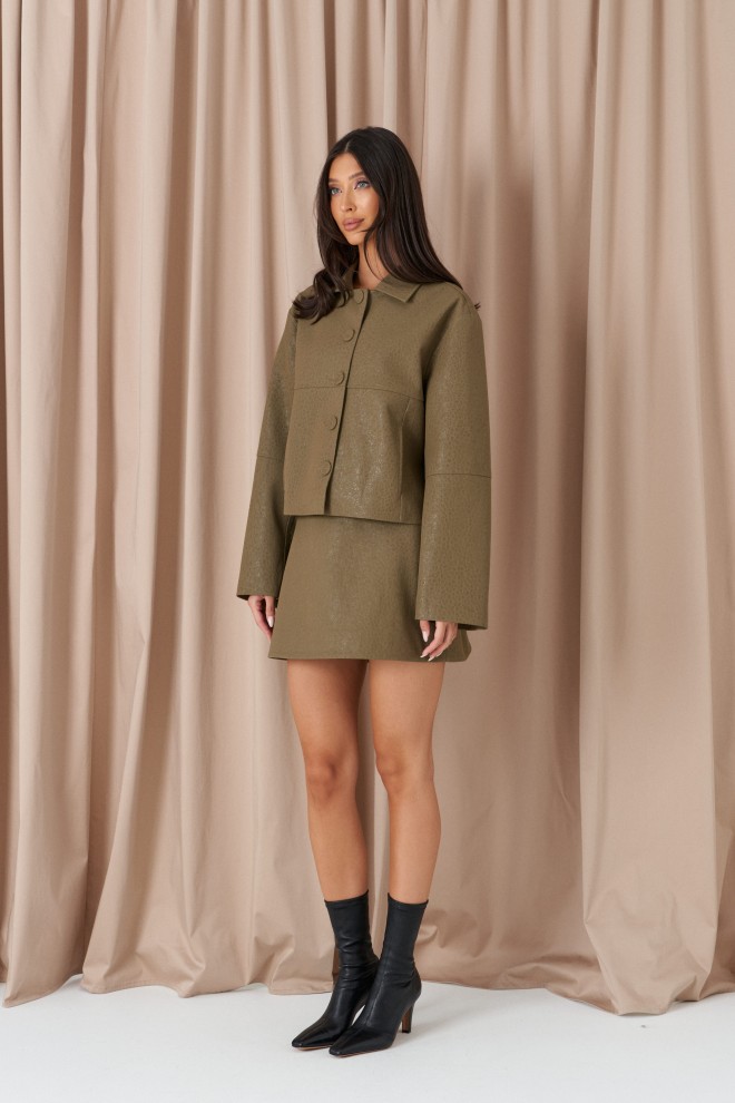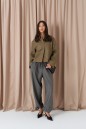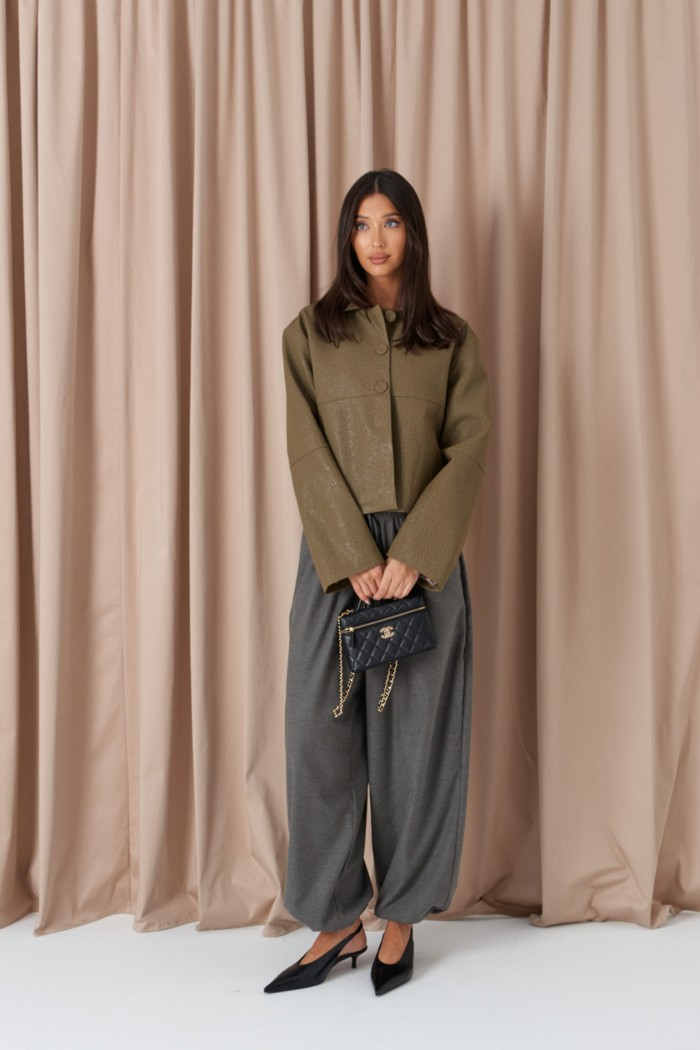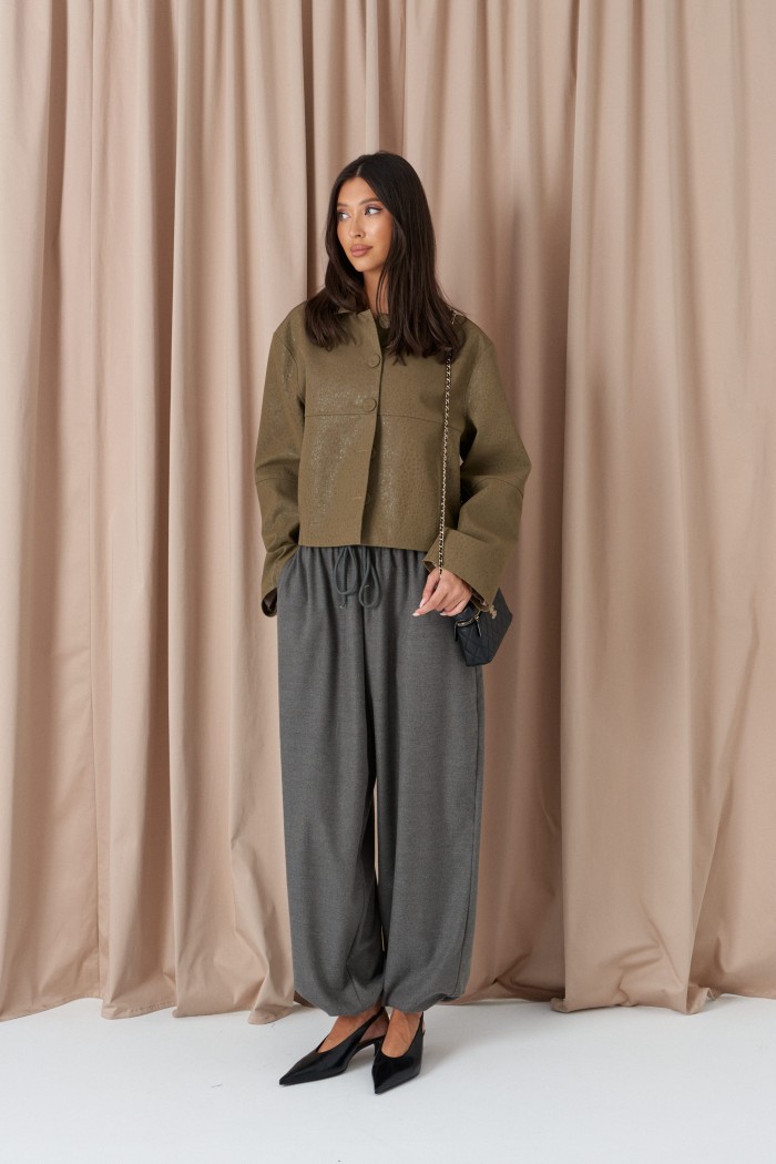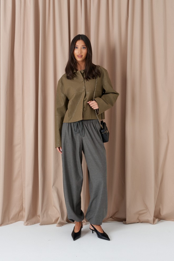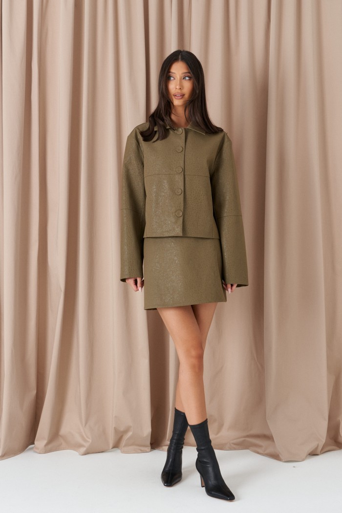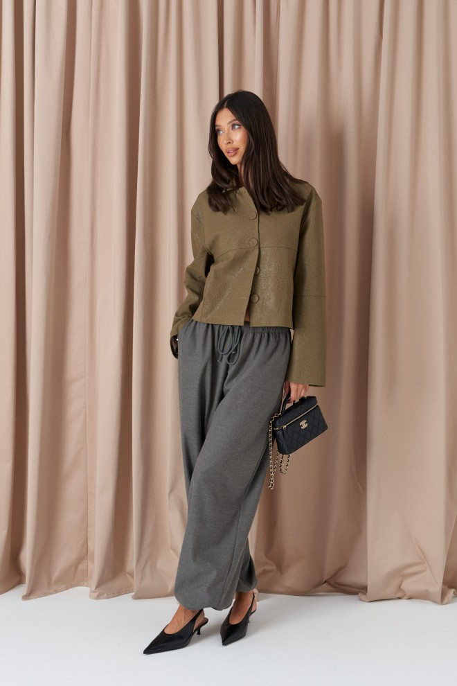 Жакет прямого кроя, выполнен из эко-кожи цвета кахи. характеристика: прямой крой, отложной воротник, центральная застежка на пуговицы, спинка и перед отрезные с вертикальными швами, спереди прорези для карманов, рукав вточной широкий, плечо спущено. Длина по спинке 52см, длина рукава от края горловины 77см.