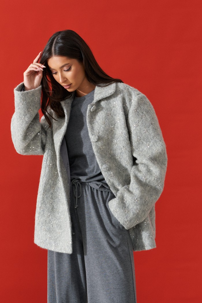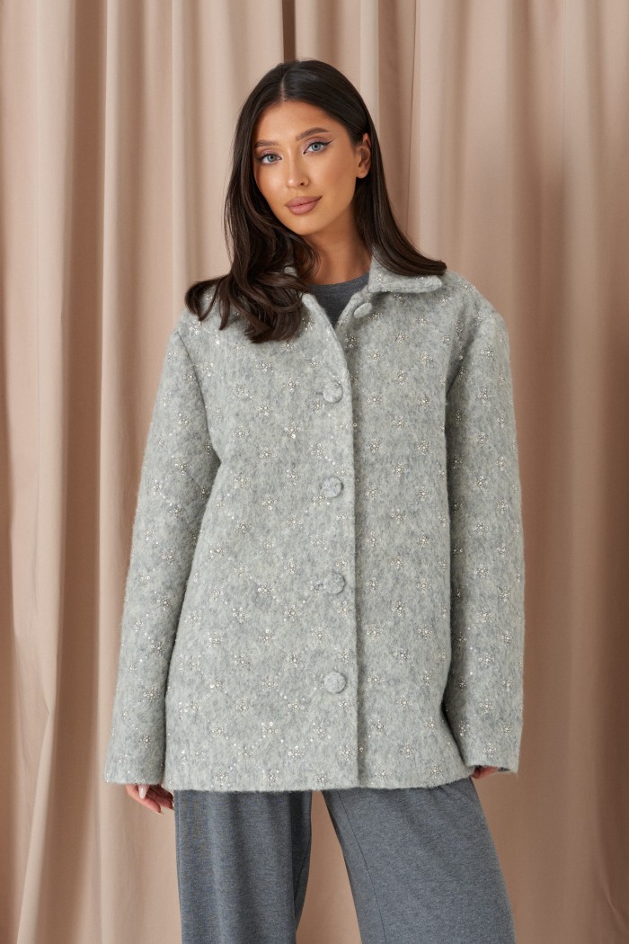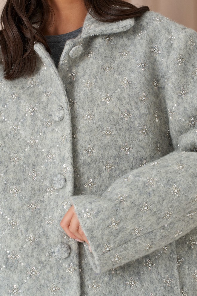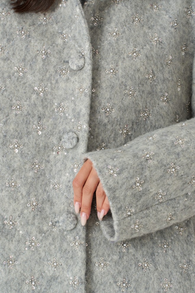 Жакет свободного прямого кроя выполнен из ворсистой ткани серого цвета с вышивкой бисерером и пайетками. Характеристики: отложной воротник, застёжка центральная на петли пуговицы, пуговицы выполнены из основной ткани изделия, брендированная подкладка, по переду изделия карманы, широкий спущеный рукав. Длина по спинке от края горловины 75 см, длина рукава от края горловины 82 см.