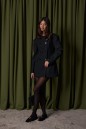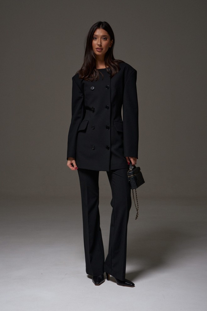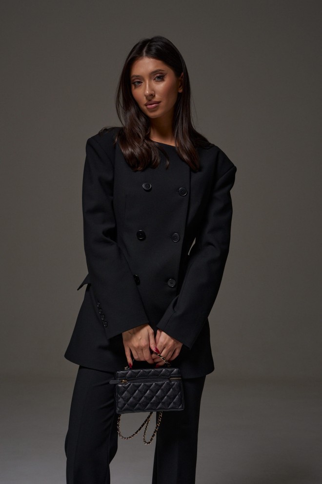 Жакет полуприталенного силуэта выполнен из текстильного полотна черного цвета. Характеристики: полуприталенный силуэт, двубортный, брендированная подкладка, подплечники, овальный вырез горловины, по переду функциональные карманы с клапаном, рукав втачной, по низу рукава нашиты пуговички. Длина по спинке 76, длина рукава 61 см.