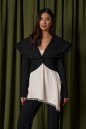 Жакет прямого кроя, выполнен из костюмной ткани черного цвета. Характеристика: двойной объемный воротник "шаль", застежка центральная на петлю - пуговицу, выточки, на подкладке, рукав втачной, по низу рукава нашиты пуговички. Длина по спинке 44 см, длина рукава от края горловины 77 см.