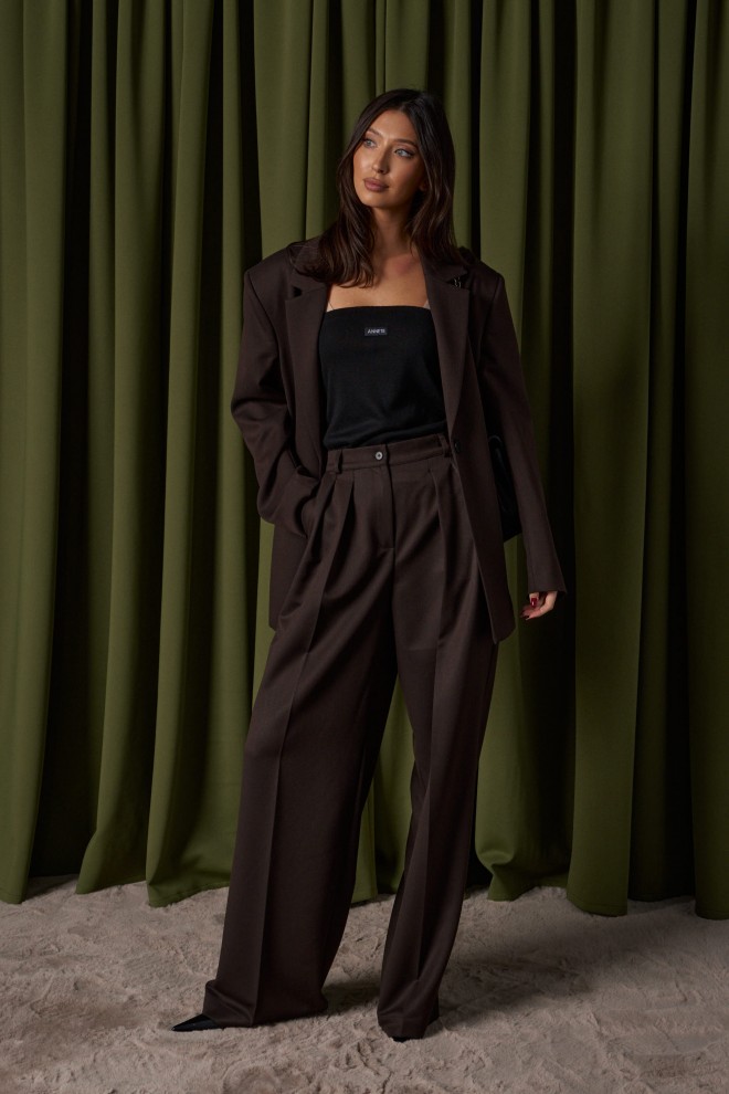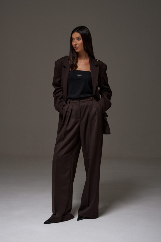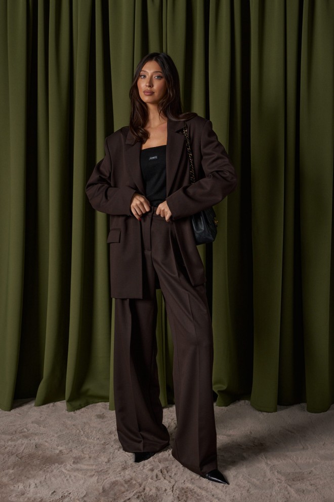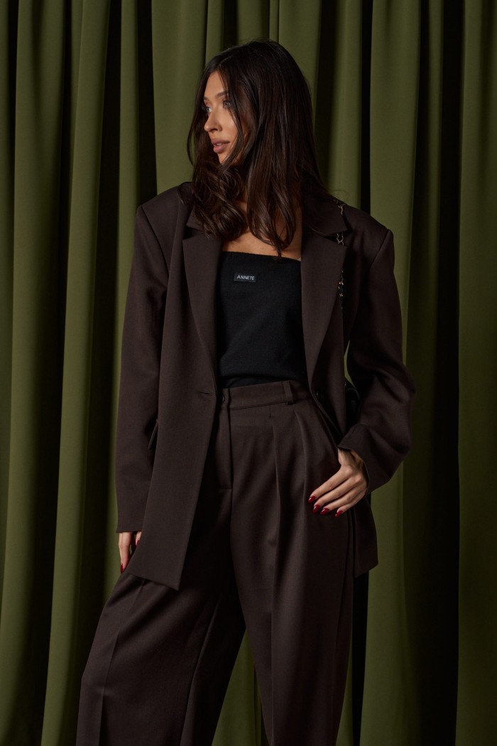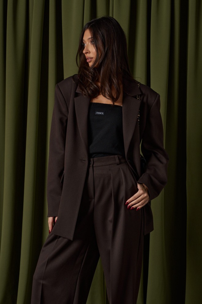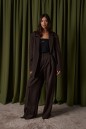Жакет прямого свободного кроя выполнен из костюмной ткани темно-коричневого цвета. Характеристики: прямой свободный крой, брендированная подкладка, подплечники, воротник с остроугольным лацканом, застежка центральная на петлю - пуговицу, по переду функциональные карманы с клапаном, рукав втачной, по низу рукава нашиты пуговички, спинка со средним швом, в среднем шве разрез 24 см. Длина по спинке 76, длина рукава от линии втачивания 63 см.