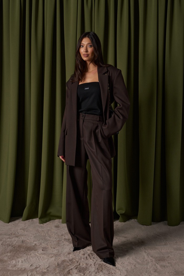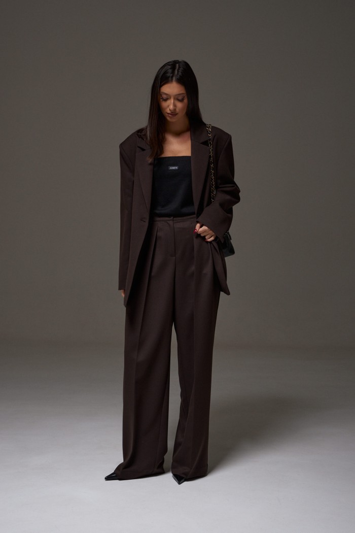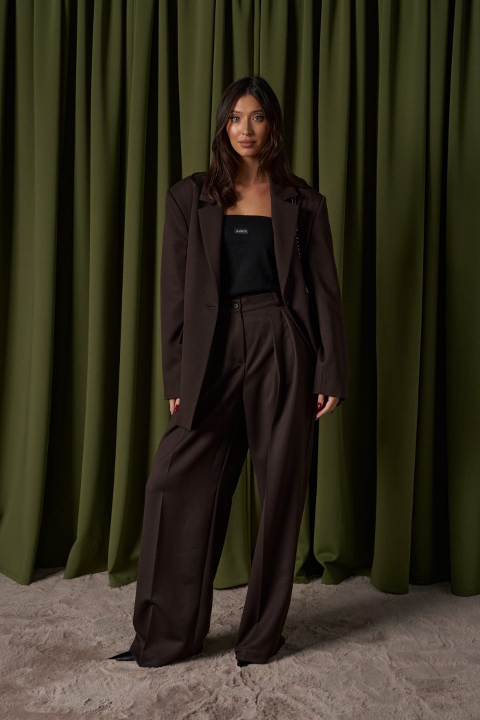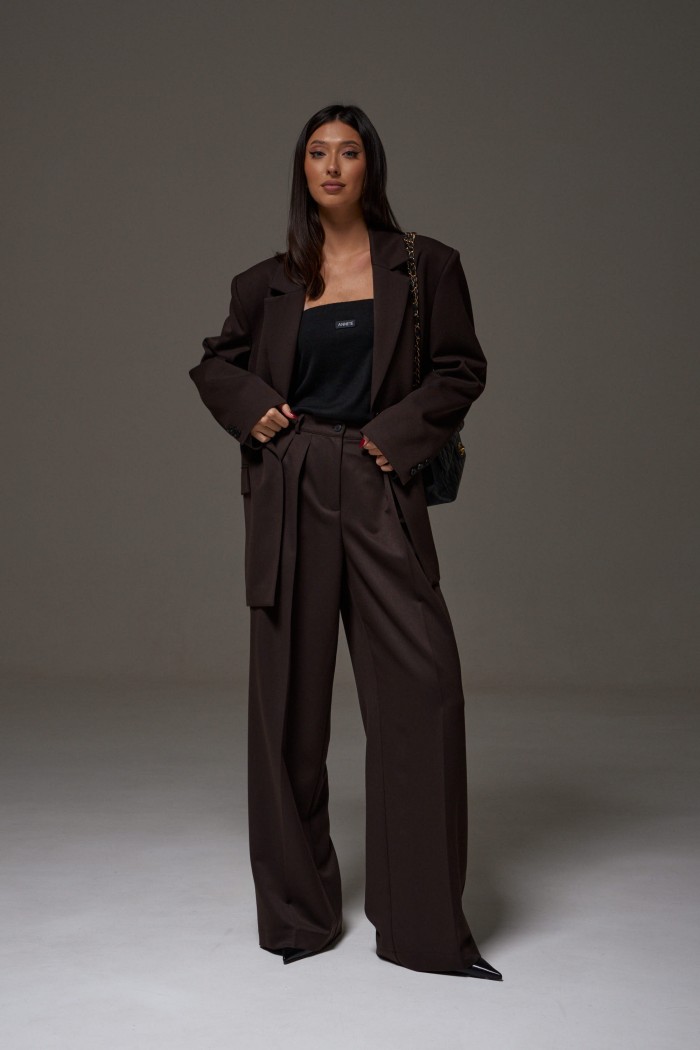 Жакет прямого свободного кроя выполнен из костюмной ткани темно-коричневого цвета. Характеристики: прямой свободный крой, брендированная подкладка, подплечники, воротник с остроугольным лацканом, застежка центральная на петлю - пуговицу, по переду функциональные карманы с клапаном, рукав втачной, по низу рукава нашиты пуговички, спинка со средним швом, в среднем шве разрез 24 см. Длина по спинке 76, длина рукава от линии втачивания 63 см.