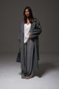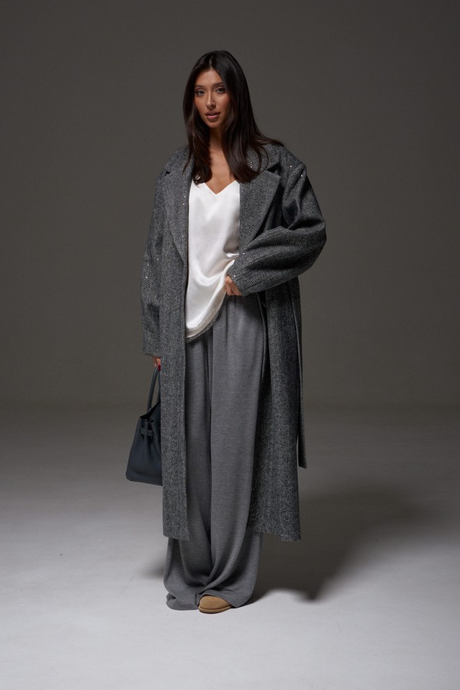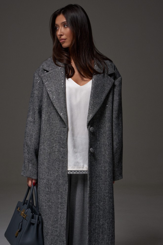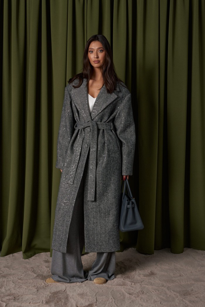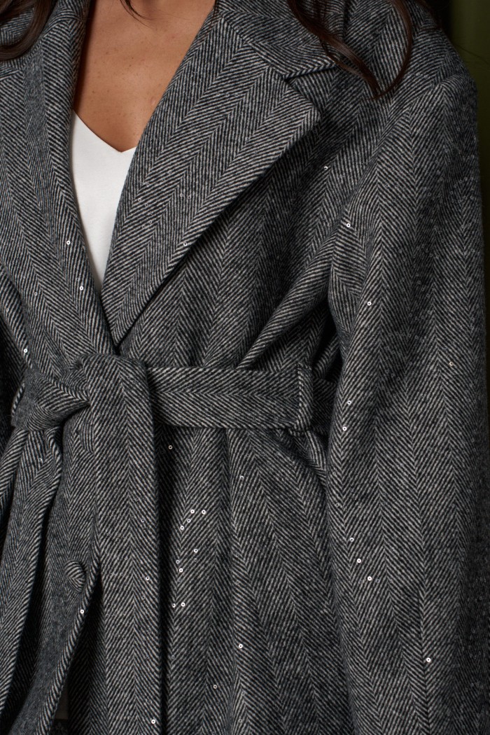 Полупальто прямого кроя, выполнено из шерстяной (смесовой) ткани серого цвета с пайетками. Характеристики: на брендированной подкладке, рукав втачной, к низу заужен, воротник пиджачного типа, в боковых швах карманы. Спинка со средним швом заканчивается шлицей, застёжка центральная на петли и пуговицы, пояс выполнен из основной ткани изделия.