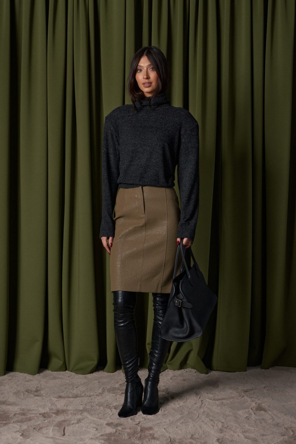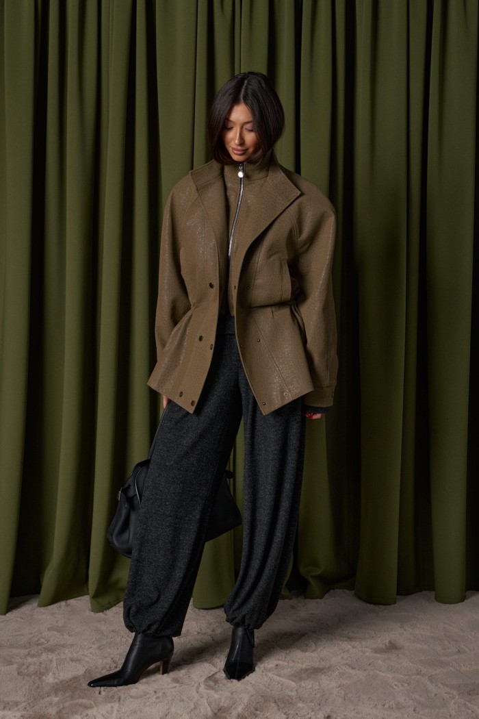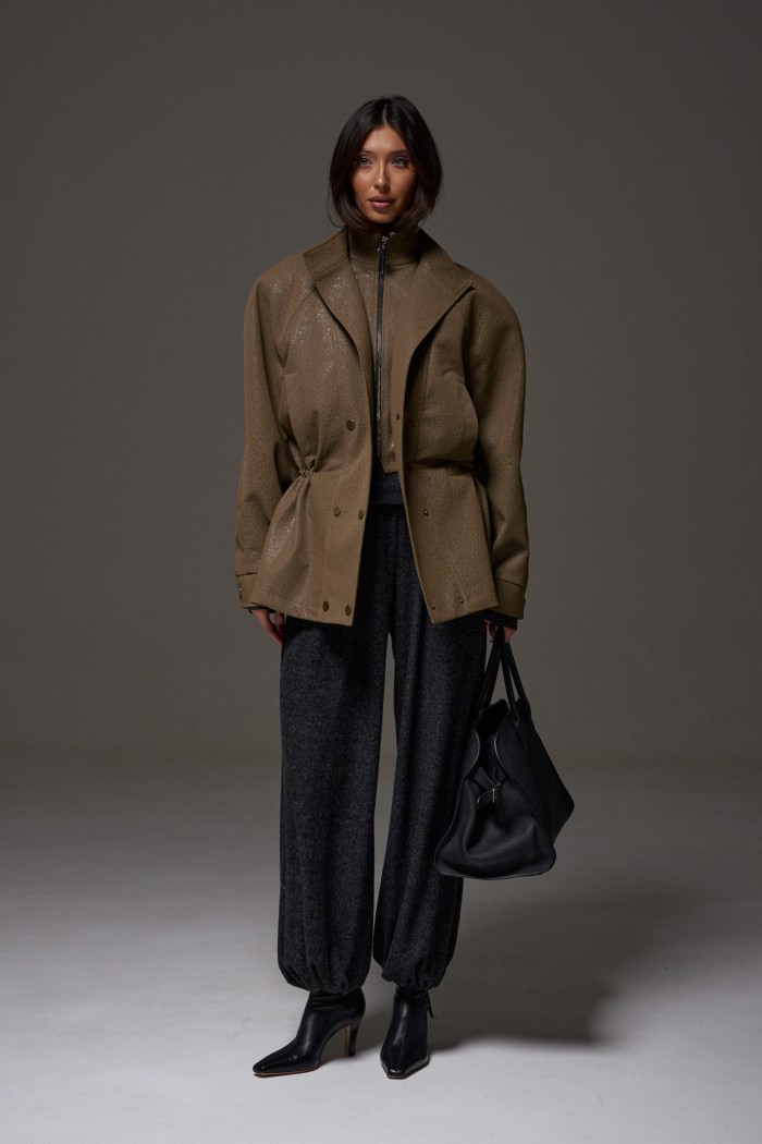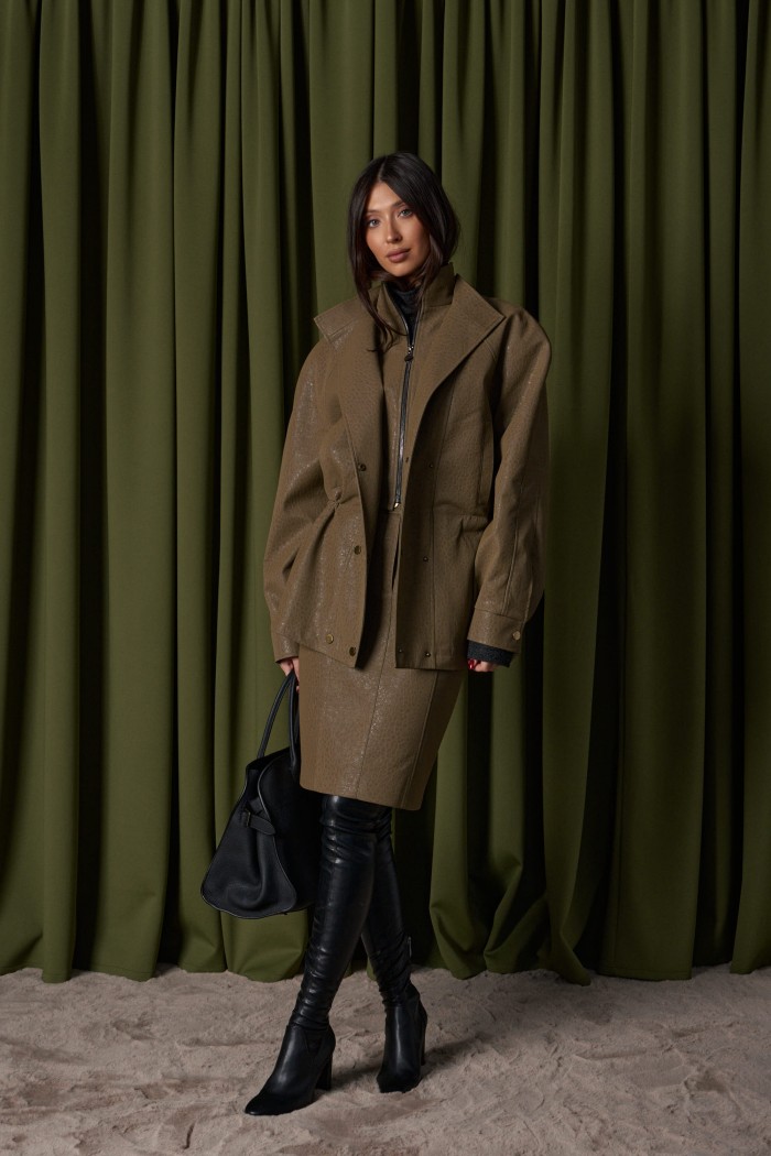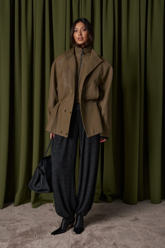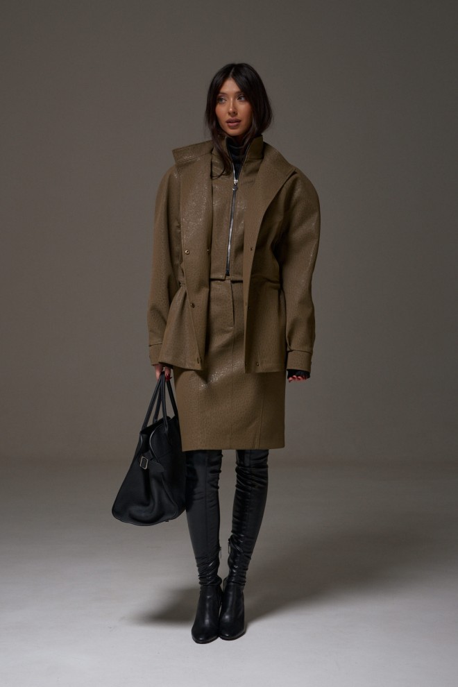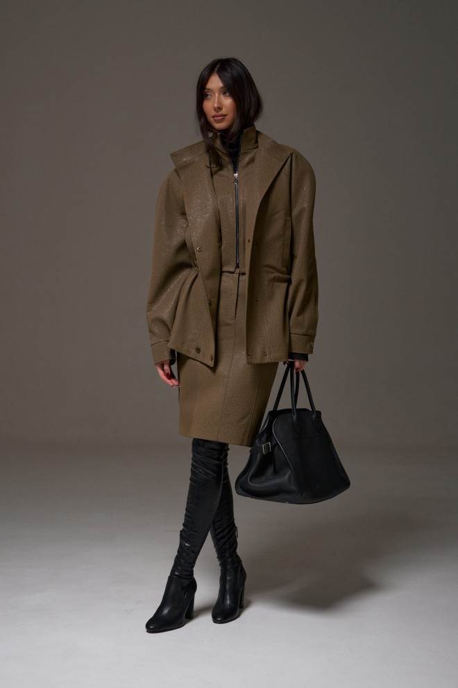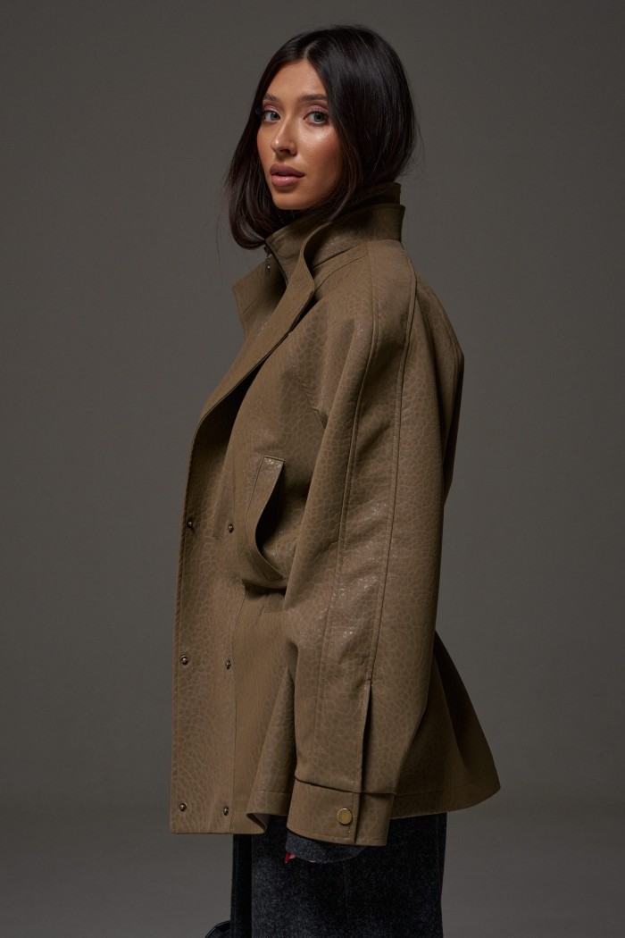 Жакет с акцентной талией, выполнен из эко-кожи цвета хаки. С подкладкой, с утеплителем (утеплитель по переду и по спинке). Характеристика: прямой свободный крой. Пояс изделия на резинке с фиксатором во внутренней части. Брендированная подкладка на утеплении (утеплитель по переду и по спинке, рукава без утеплителя). Горловина стойка, манишка из основной части изделия на молнии. Застежка центральная двубортная на шесть кнопок. Функциональные карманы в части груди. Рукав реглан, центральная часть прошита планкой, низ рукава фиксируется кнопкой. Длина по спинке 72.5 см, длина рукава от края горловины 80см.