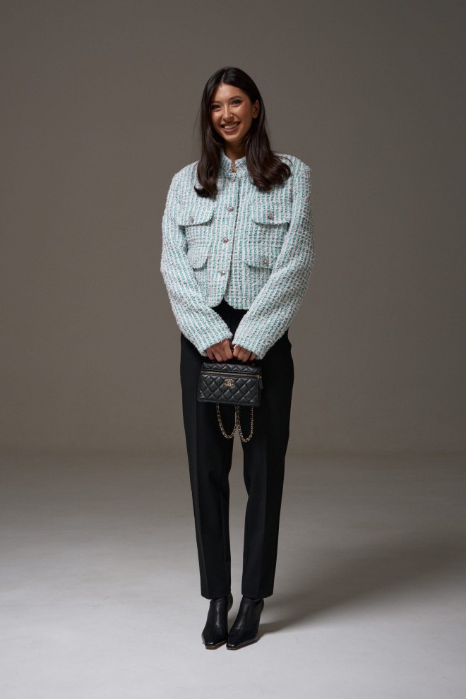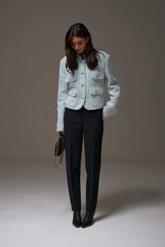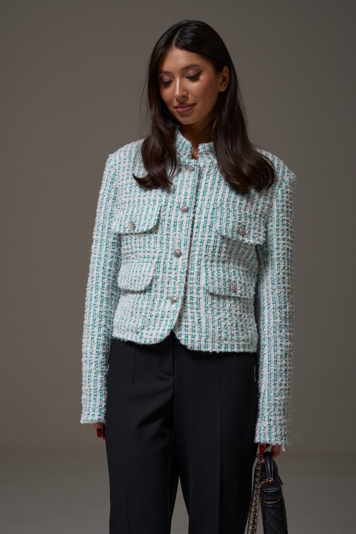 Жакет прямого свободного кроя, выполнен из фактурного твидового полотна. Характеристики: горловина стойка, застежка центральнаяна петли пуговицы, подплечники, рукав прямой, внутри брдендированная подкладка. На уровне линии груди декоративные карманы с клапаном, внизу накладные карманы с клапаном. Длина по спинке 53 см, длина рукава 65 см.