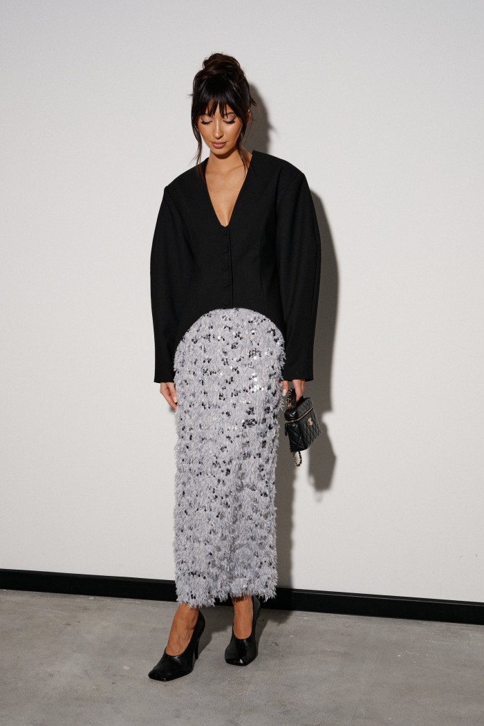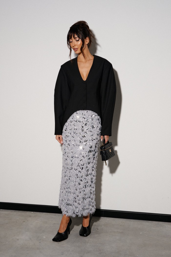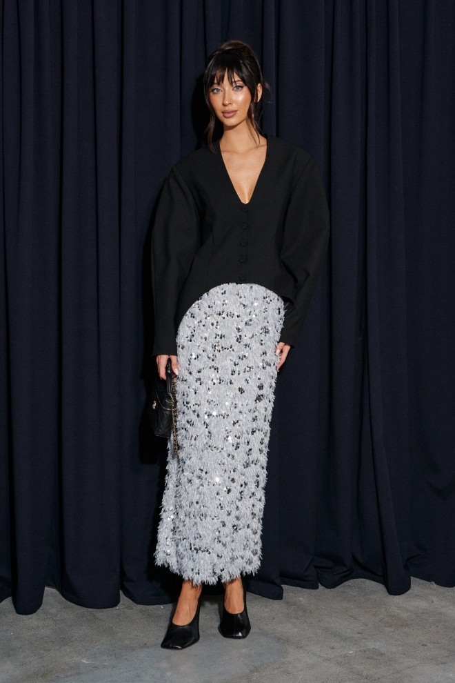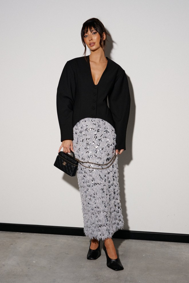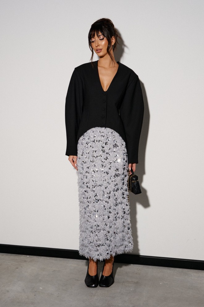 Жакет приталенного силуэта, выполнен из костюмной ткани черного цвета. Характеристика: v-образный вырез, по переду и сзади изедлия простроченные выточки. Застежка центральная на петли - пуговицы. Снизу изделия, плавный срез. Подплечники, рукав втачной, к низу заужен. Брендированная подкладка. По спинке два разреза. Длина спинки по среднему шву 75см., длина рукава от края горловины 80см.