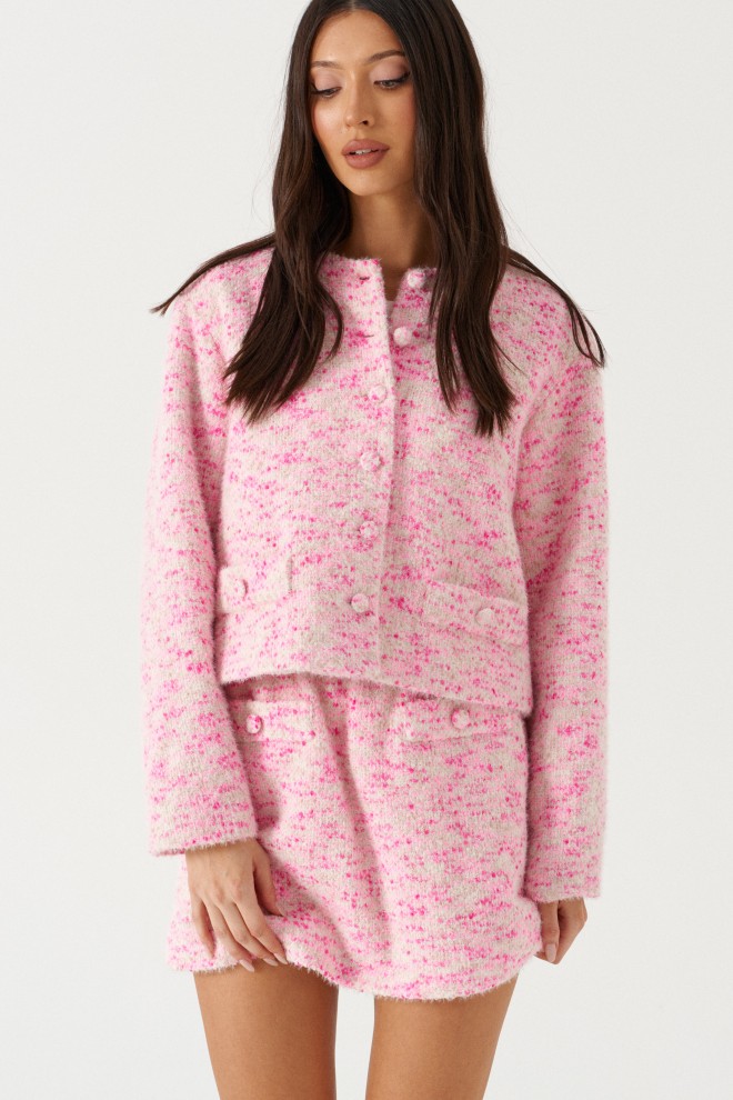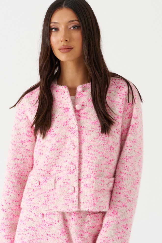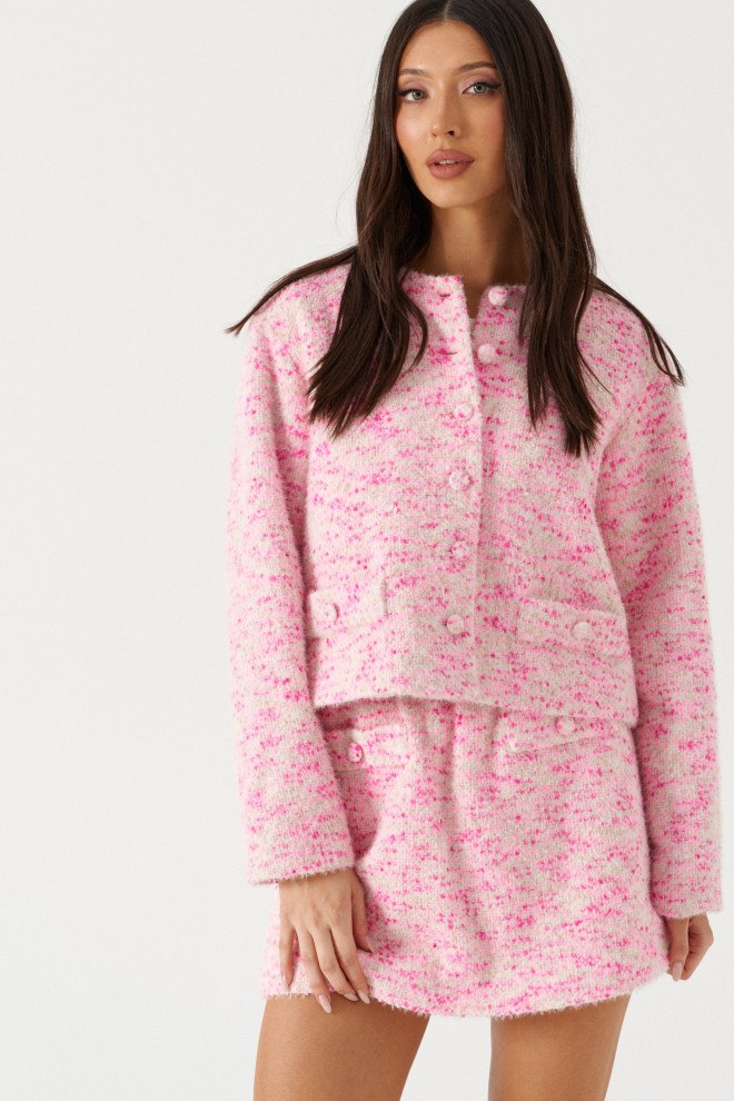 Жакет уороченный прямого кроя, выполнен из твидовой ткани бежево-розового цвета. Характеристика: прямой крой, овальная горловины, центральная застежка на петли-пуговицы, спереди изделия имитация карманов, подклад. Длина рукава от края горловины 73см. Длинаизделия по центру спинки 51см.