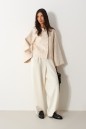 Жакет свободного прямого кроя, выполнен из мягкой ткани светло-бежевого цвета в белый горох. Характеристика: прямой крой, горловина круглая, застежка центральная на петли-пуговицы, рукав втачной спущенный, расширяется к манжету, брендированный подклад. Длина рукава от края горловины 71см. Длина по центру спинки 55 см