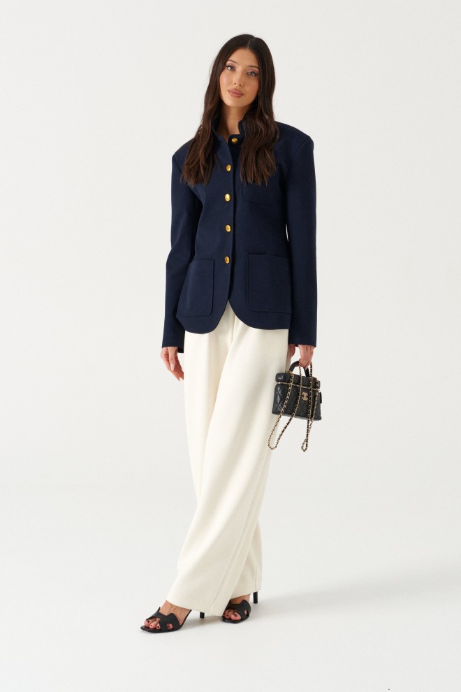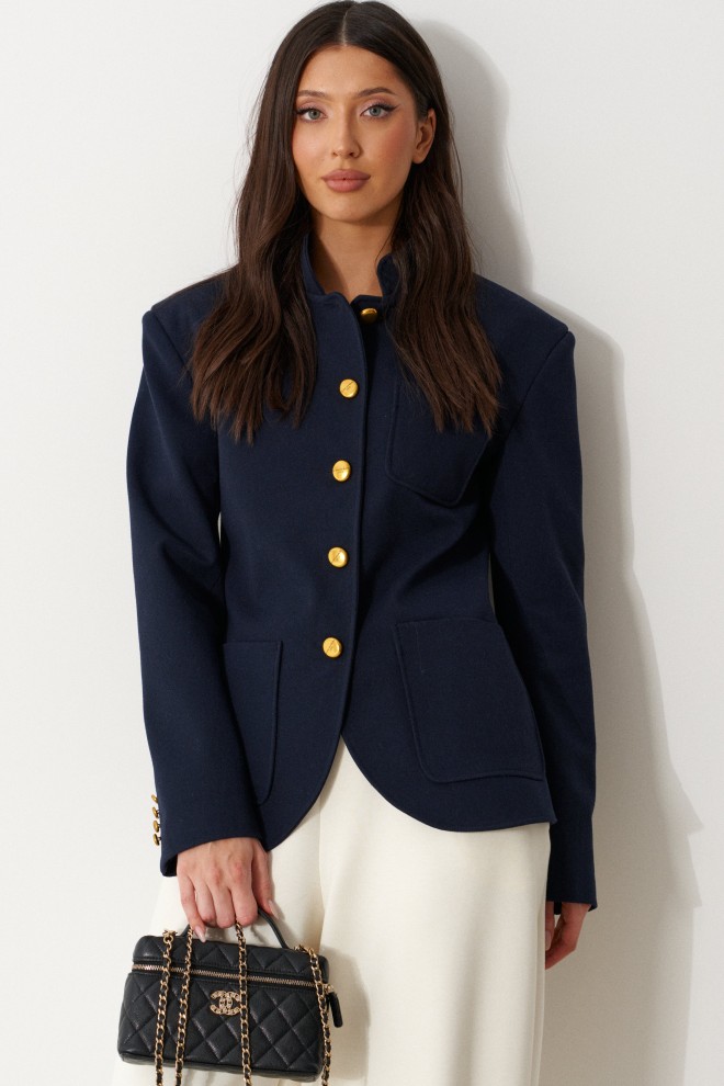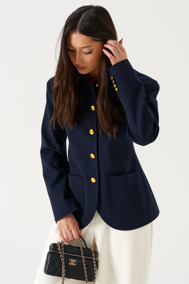 Жакет полуприталенного силуэта, выполнен из полотна темно-синего цвета. Характеристика: слегка приталенный силуэт, воротник стойка, уентральная застежка на пуговицы, на груди слева накланой карман, чуть ниже талии по обе стороны накладные карманы, гакругленные борта, брендированный подклад, плечики, втачной рукав, по низу декоративные пуговички, спинка с центральным застроченным швом, на талии выточки. Длина рукава от шва втачивания 63см. Длина изделия по центру спинки 65см.