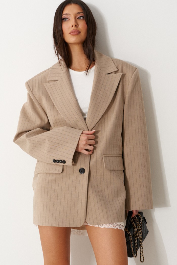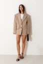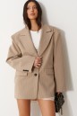 Жакет прямого кроя, выполнен из костюмной ткани песочного цвета в узку полоску. Характеристика: прямой свободный крой, воротник с остроугольным лацканом, застежка центральная на пуговицы, брендированный подклад, спереди прорези для функцинальных карманов с клапанами, плечо спушенное, рукав свободный, с декоративными пуговицами, в центральном шве по спинке разрез 25 см. Длина плеча 19 см, длина рукава от места втачивания 64см. Длина изделия по центральному шву по спинке 76 см.