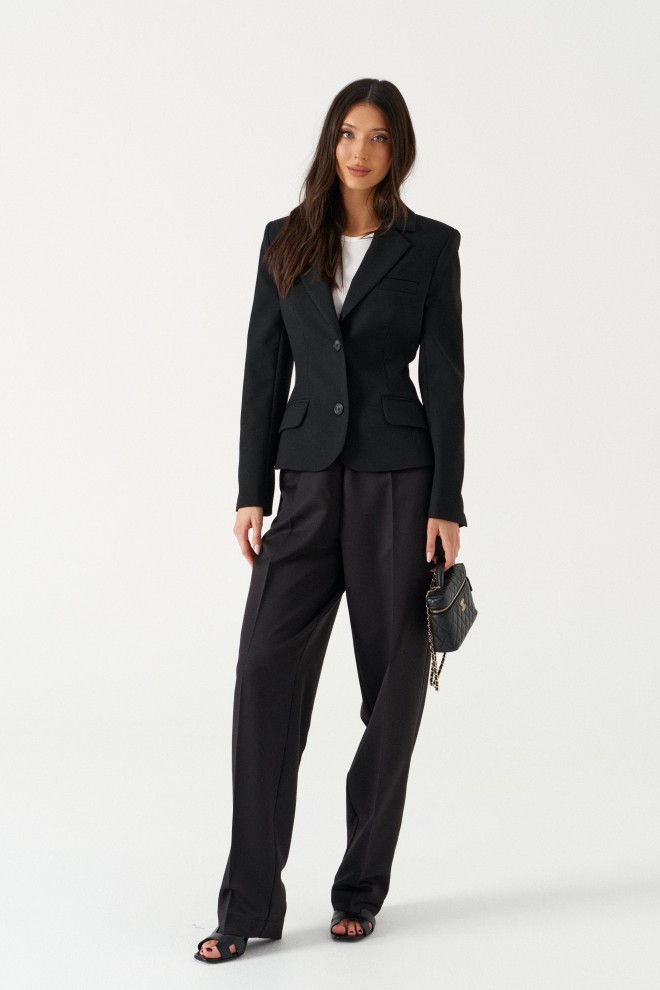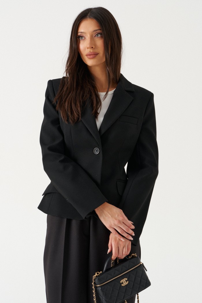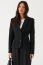 Жакет приталенного кроя выполнен из текстильного полотна черного цвета. Характеристики: приталеный крой, однобортный, брендированная подкладка, застежка центральная на петли и пуговицы, по переду накладные функциональные карманы, рукав втачной, три пуговицы на манжете. Длина рукава 64см, длина изделия 58см.