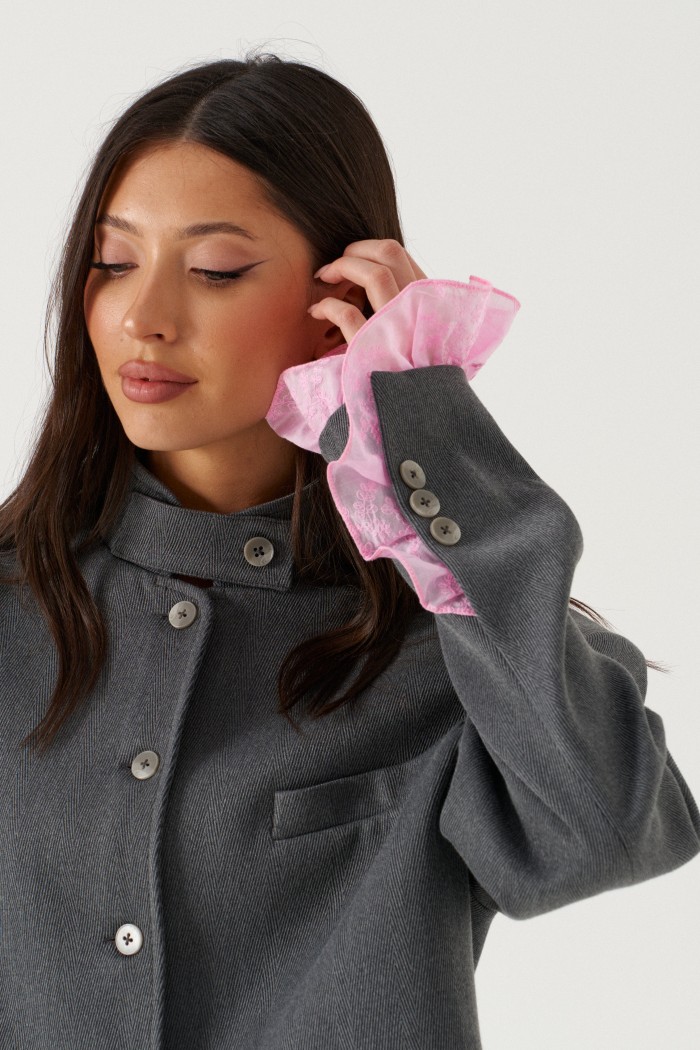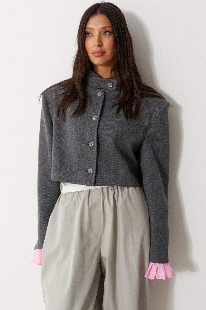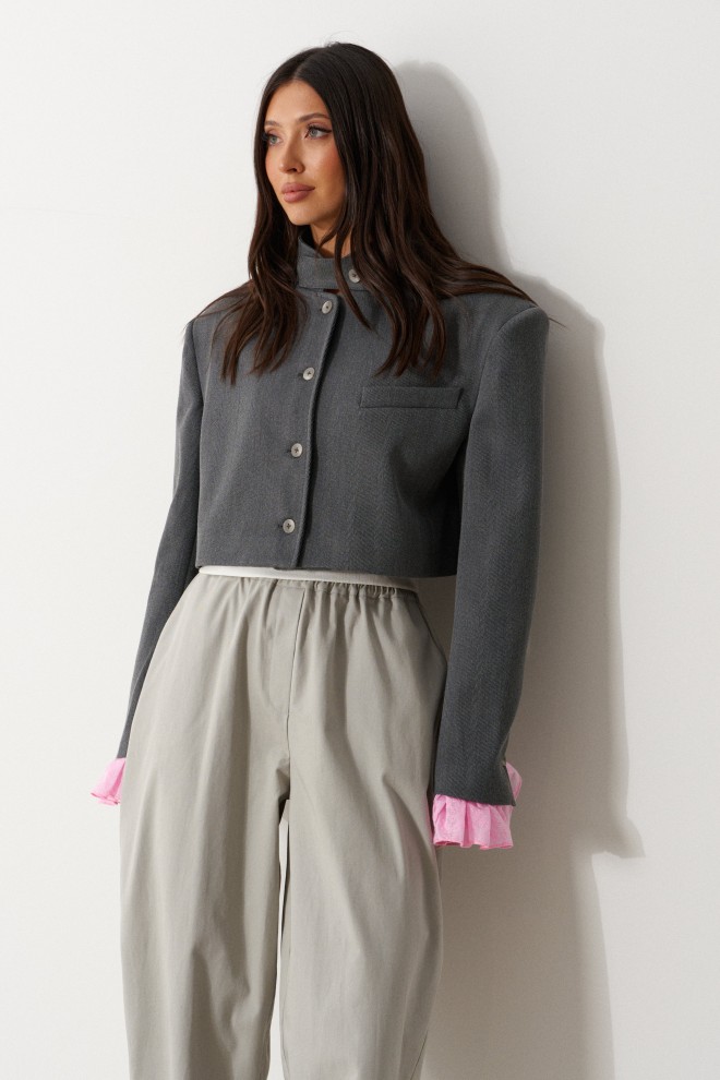 Жакет женский, прямого силуэта, укороченный, на подкладке. Выполнен из текстильной, фактурной ткани серого цвета, рисунок елочка. Характеристика: горловина стойка с хлястиком, застегивается на петлю с пуговицей. Застежка центральная бортовая, застегивающаяся на петли, пуговицы. Подплечники. Брендированная подкладка. Рукав втачной двухшовный, по низу рукава вставлена рюша из тонкой хлопковой ткани. Рюша притачная. По низу рукава нашиты пуговицы. Спинка с двумя рельефными швами. Длина жакета по спинке 43 см. Длина рукава без рюши 63 см.