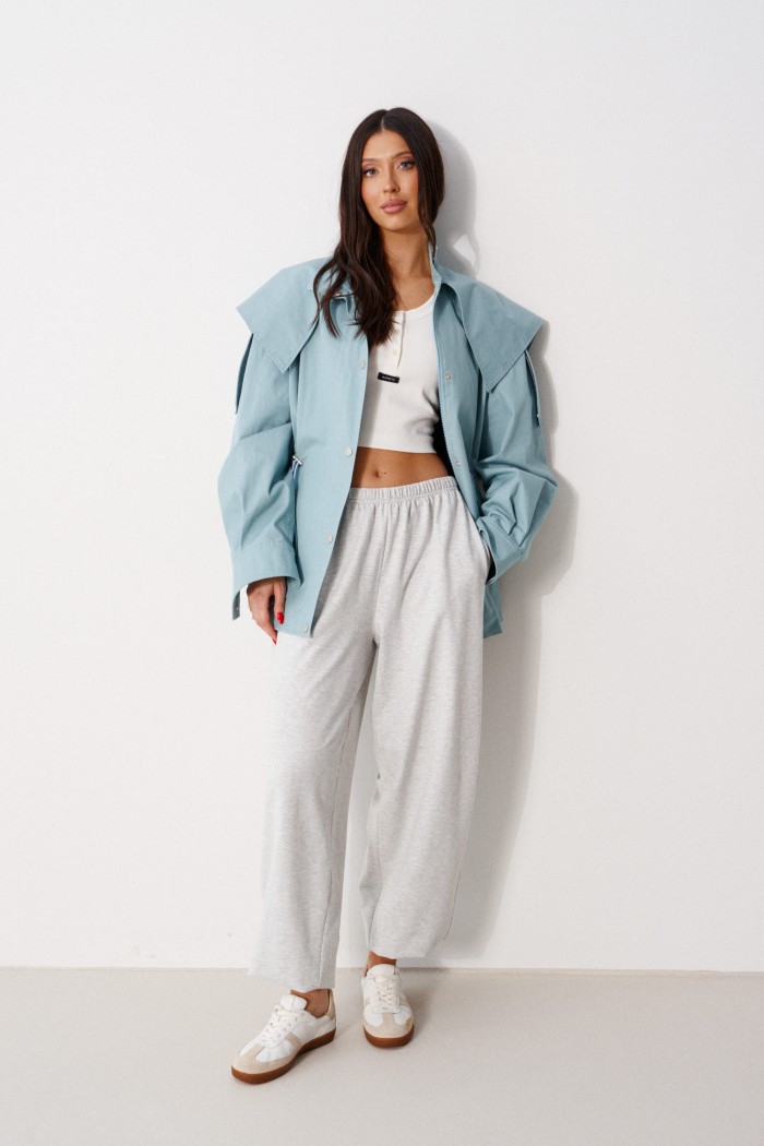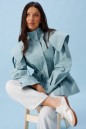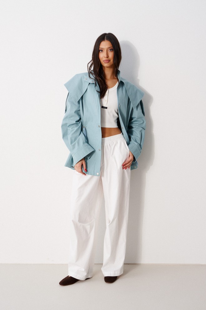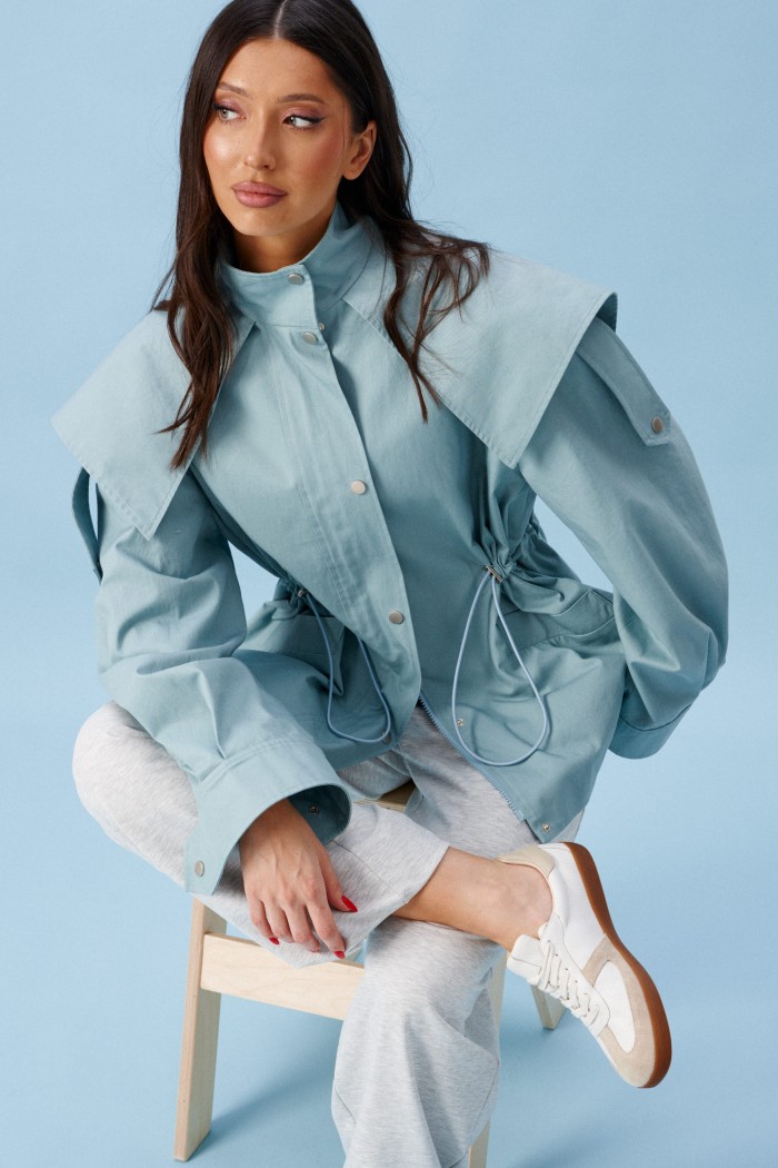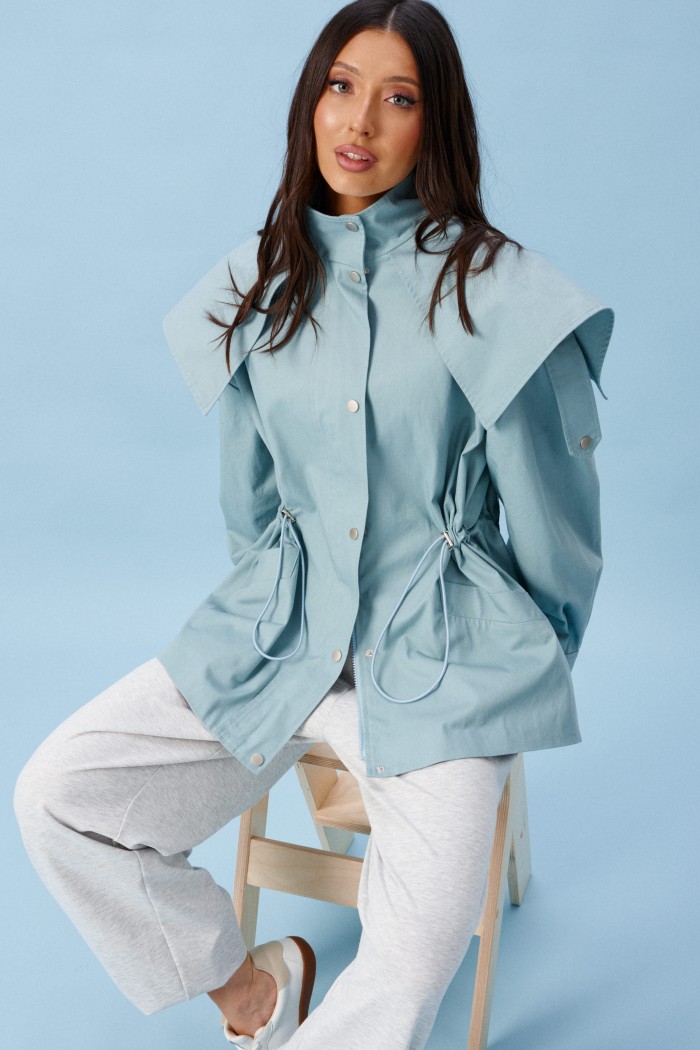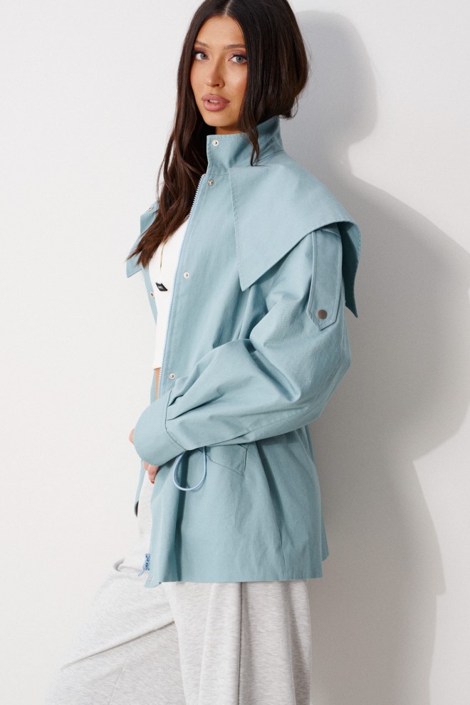Куртка прилегающего силуэта, выполнена из хлопкового полотна бирюзового цвета. Характеристика: приталенный силуэт, на подкладке, вырез горловины круглый с притачным воротником-стойкой. По переду и спинке цельная отлетная кокетка. Рукав спущенный, втачной, с патой от плеча вниз, и притачной манжетой, застегивающейся на кнопку. По переду прорезные карманы с накладными листочками. По линии талии кулиса с втянутым шнуром-резинкой, регулируемым по ширине фиксаторами. Застежка центральная, на молнию, закрытую по верху планкой с пробивными кнопками. Длина рукава от линии втачивания (с учетом манжеты) 56 см, длина по спинке 74 см.