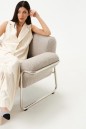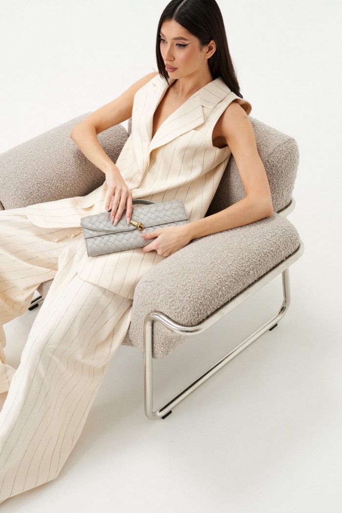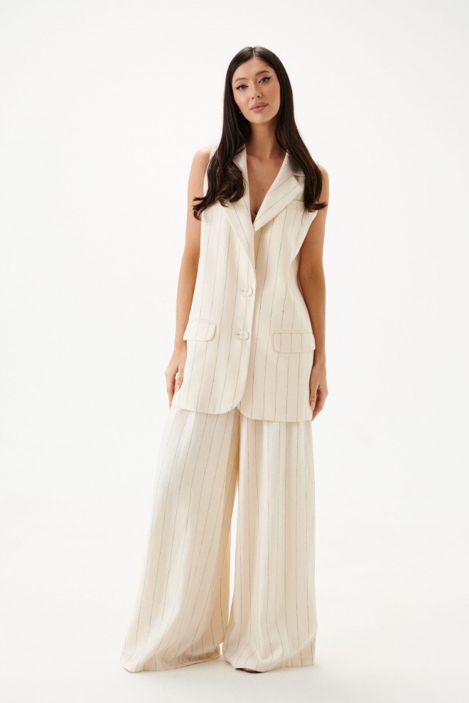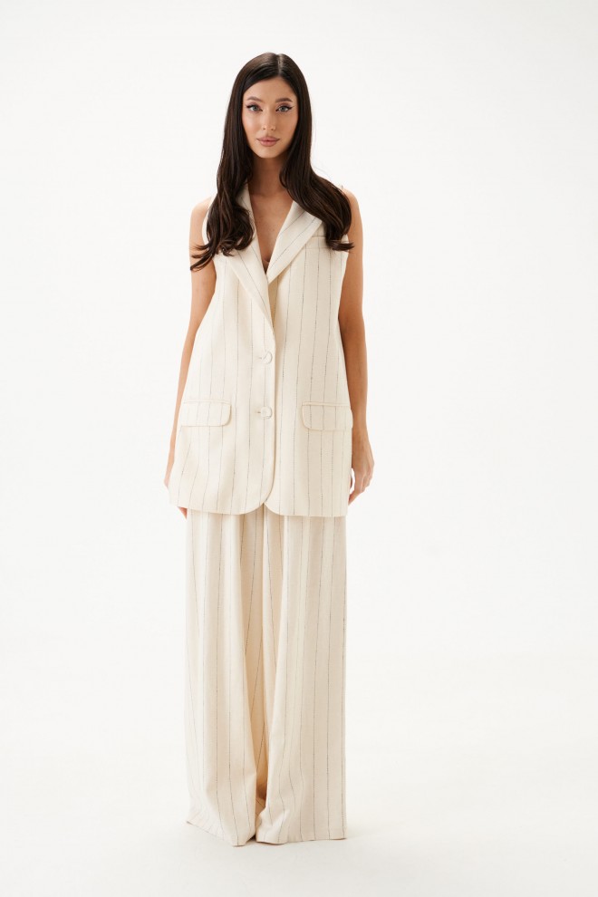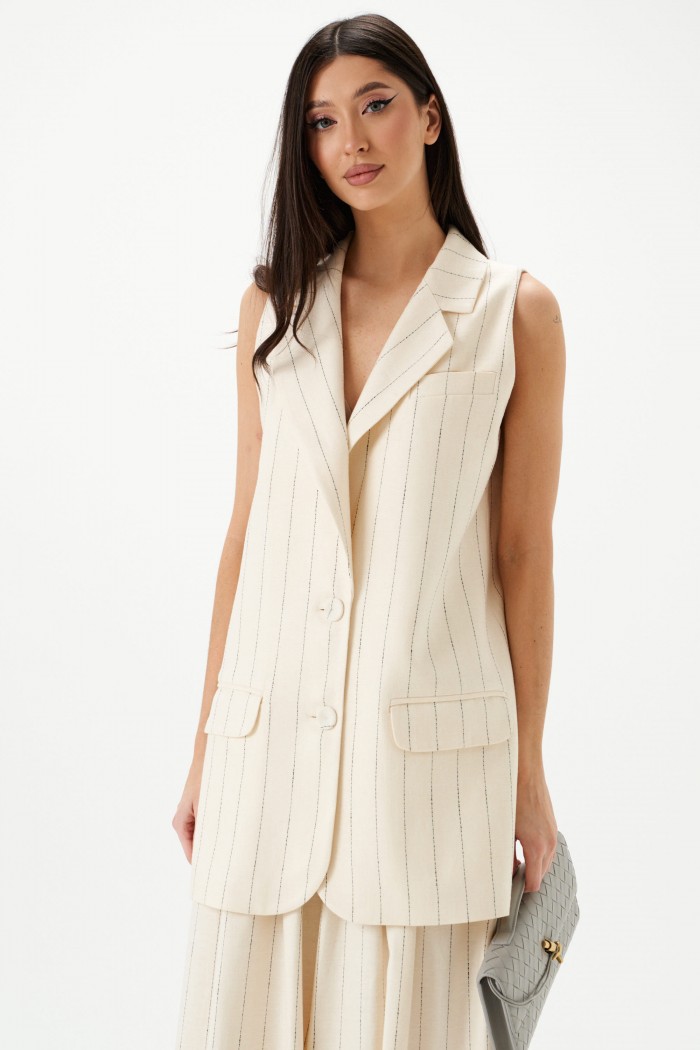 Жилет однобортный. Выполнен из текстильного полотна, молочного цвета. Прямой крой, подкладка, воротник отложной с широким лацканом. По переду два функциональнных кармана. Застежка центральная на петли - пуговицы. Длина по спинке 80см.