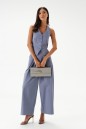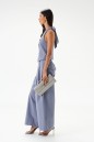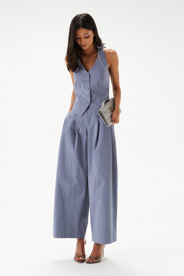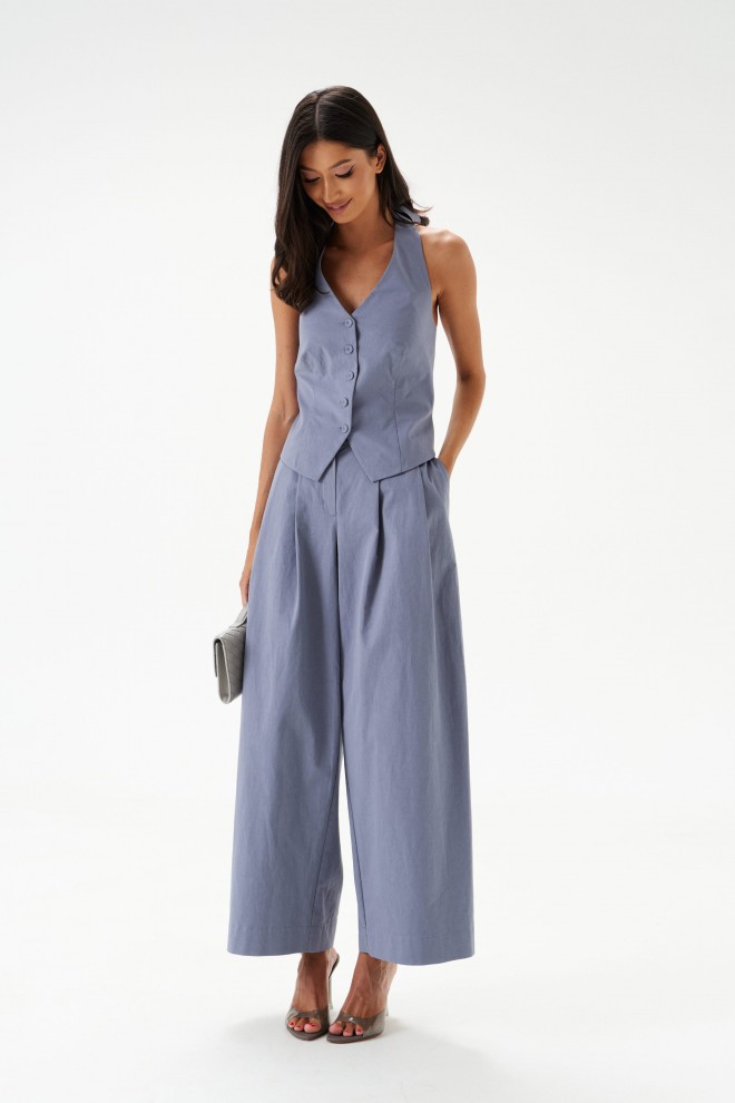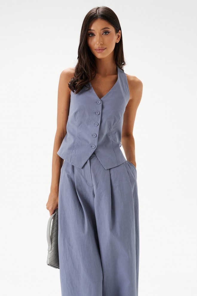 Жилет полуприлегающего силуэта. Выполнен из хлопкового полотна серо-голубого цвета. С подкладкой. Вырез горловины V-образный, переходящий в завязки на спине. Спинка открытая. Низ жилета фигурный. Застёжка центральная – пуговицы. Длина по боковому шву от проймы 24 см. Жилет дополнят брюки А1543