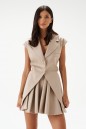 Жилет полуприталленого силуэта. Выполнен из костюмной ткани песочного цвета. Характеристика: отложной воротник с остроугольными геометрическими лацканами, хлопковый подклад, по передней части лифа имитация кармана, талиевые вытачки по спинке,застежка центральная на 3 пуговицы. Спинка присборена на боковые завязки. Длина спинки от края горловины 73 см.