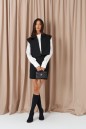 Жилет прямого свободного кроя выполнен из текстильного полотна черного цвета. Характеристики: прямой свободный крой,брендированная подкладка, застежки центральные на петли - пуговицы, декоративный карман. Длина по спинке 41см.